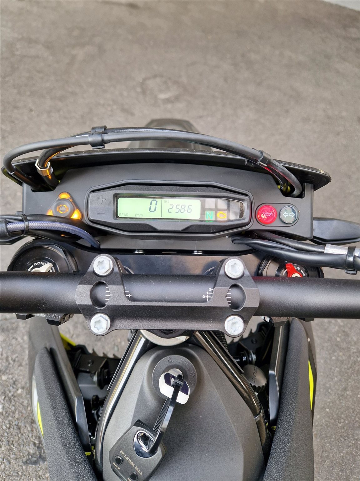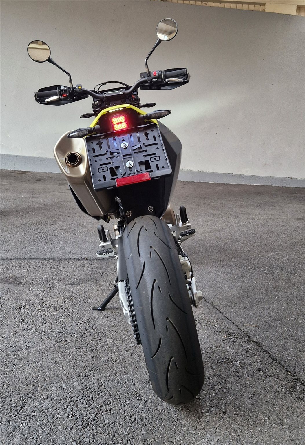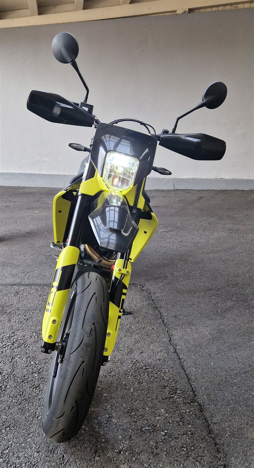 Zum Verkauf steht eine neuwertige Husqvarna 701 Supermoto (Ez. 2025) mit 258 km in einem coolen schwarz/gelben Outfit. Scheinwerfer, Rück-/Bremslichte und Nummerntafelbeleuchtung wurden von Halogen auf LED getauscht - die weißen Kunststoffteile wurden gegen schwarze getauscht,