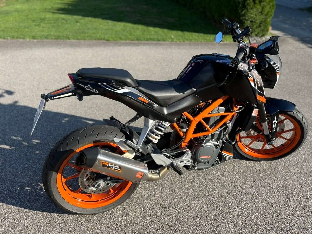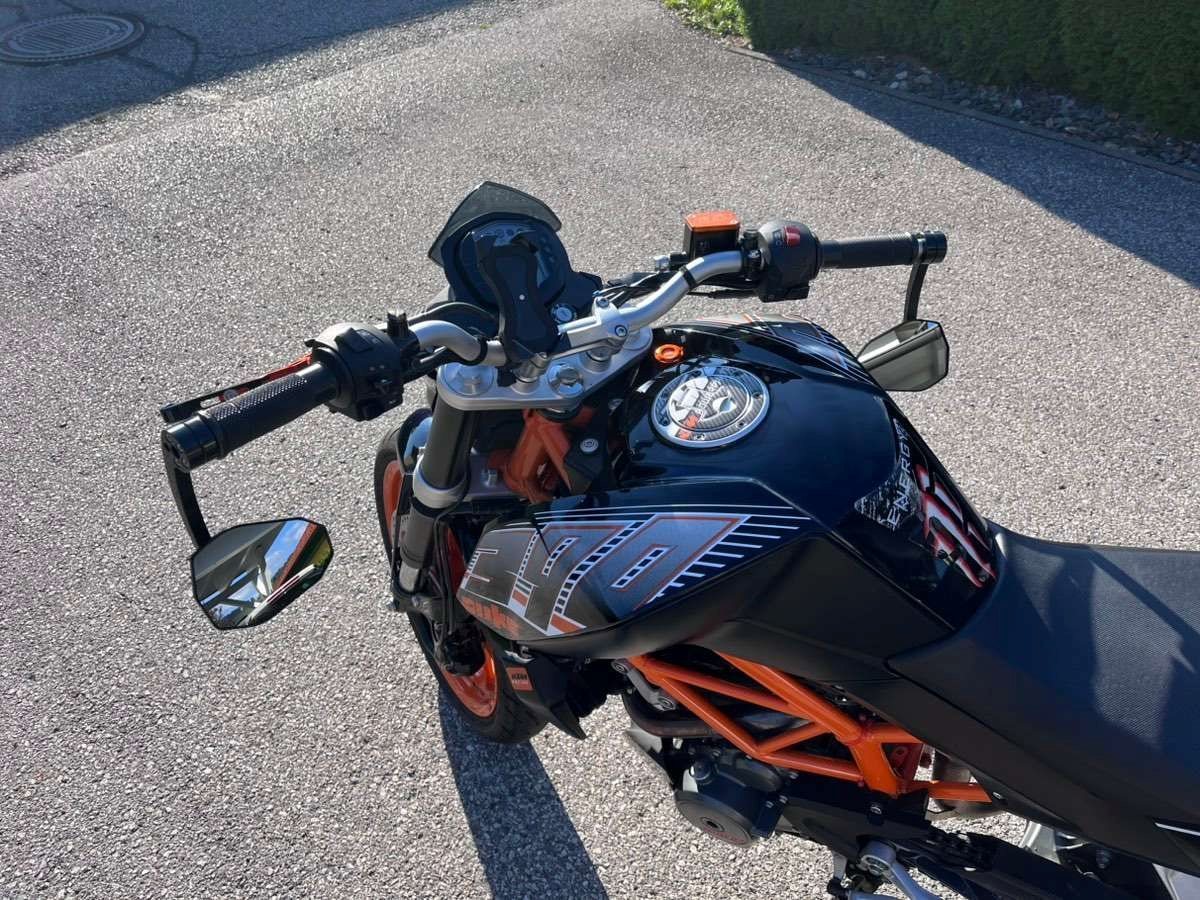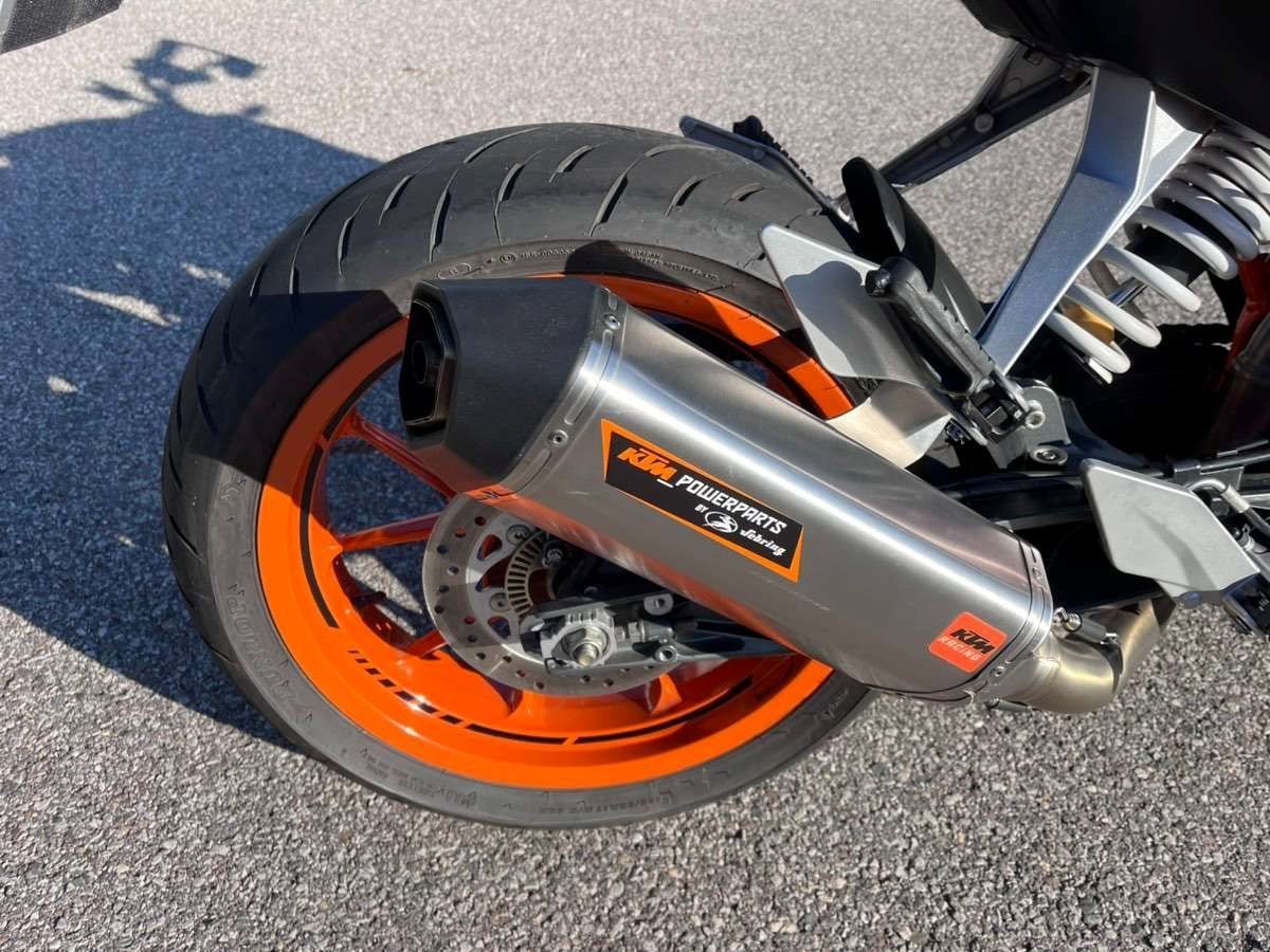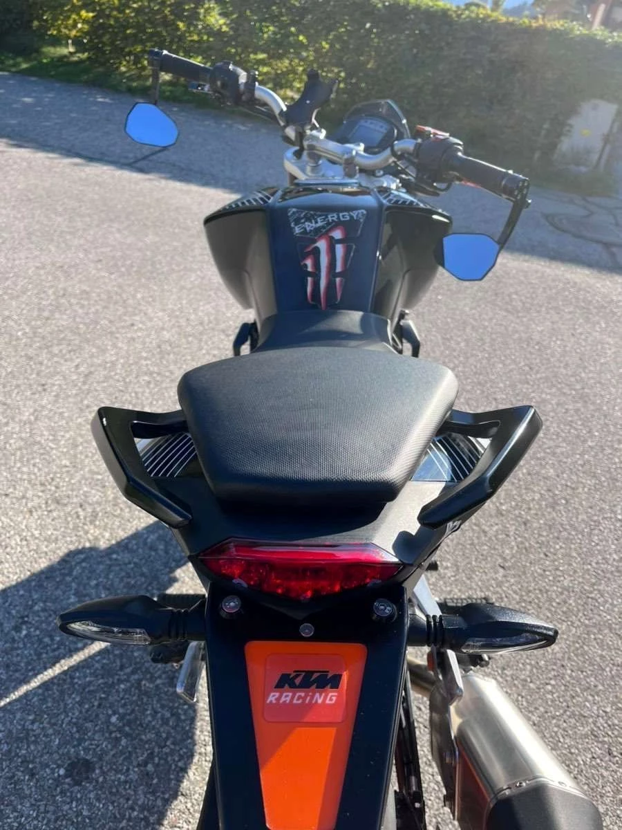 Es sind etliche KTM Powerparts verbaut wie zB: Brems- und Kupplungsgriffe, kurzes Heck usw., Spiegel Highsider, Handyhalterung, die Reifen sind neuwertig,