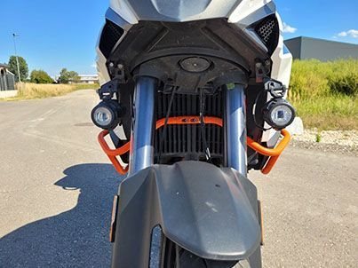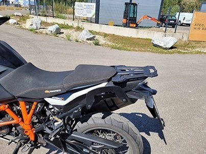 Extras: Geteilte Sitzbank und beheizbar (original Sitzbank vorhanden, wird mitgegeben), Hauptständer, großes Motorschutzblech, Zusatzscheinwerfer, Scottoiler, orginal KTM-Gepäckträger, Alufrästeil für Hepco-Becker System, Seitengepäcktaschen versperrbar auf Hepco-Becker System.