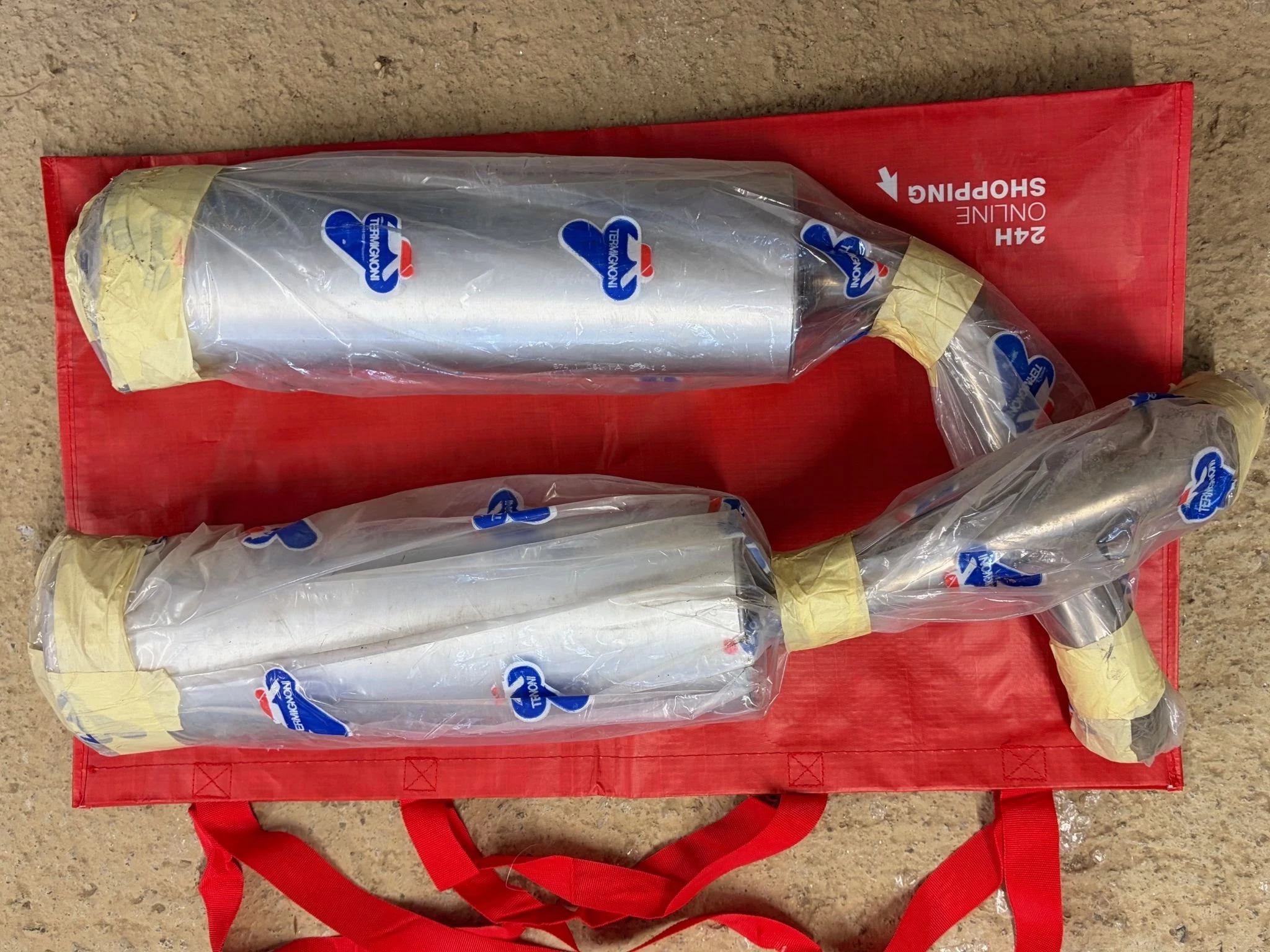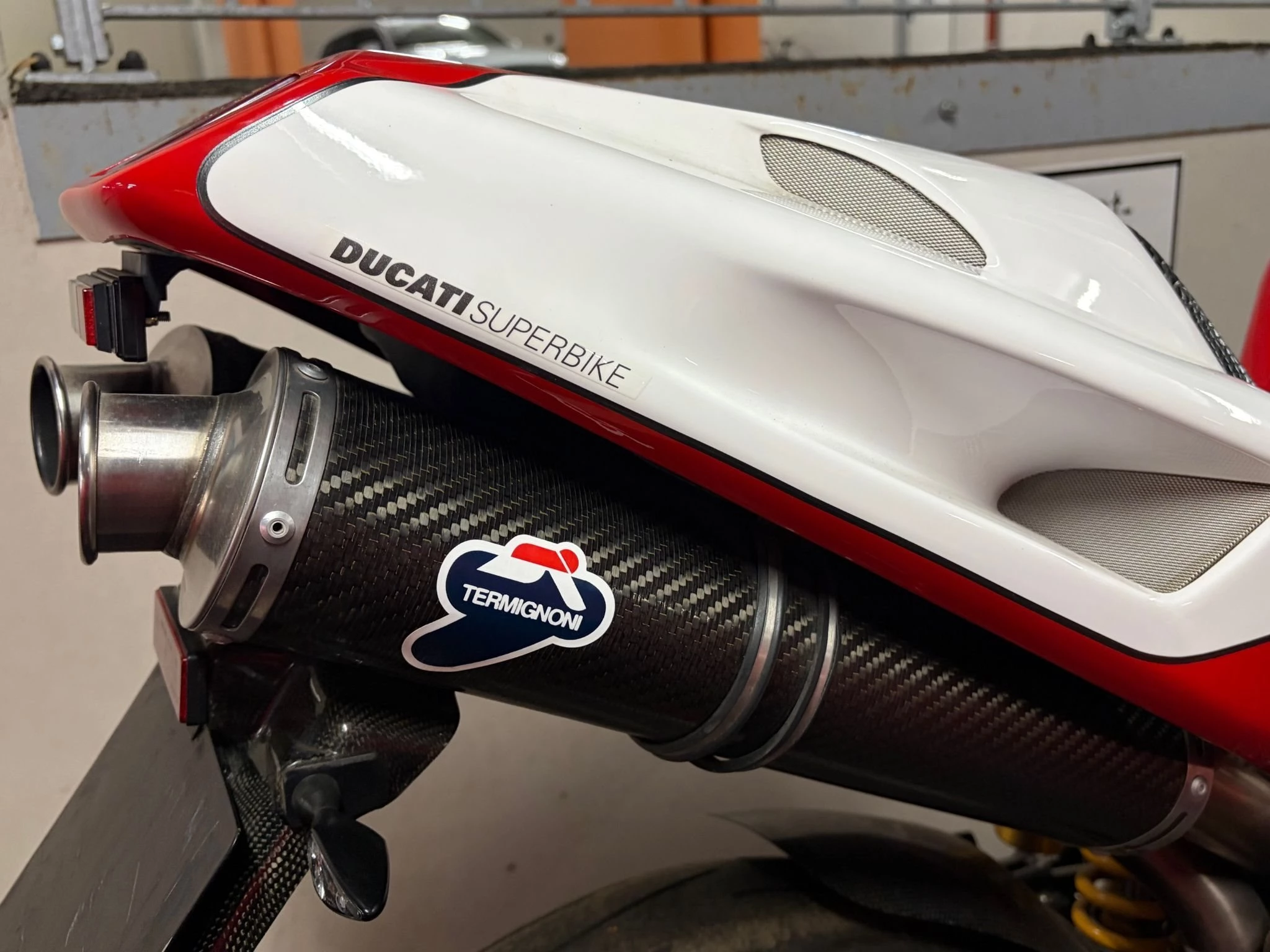 Verbaut: Monoposto-Heck (weißes Feld), R-Aufkleber und die Termignoni Auspuff Endtöpfe.