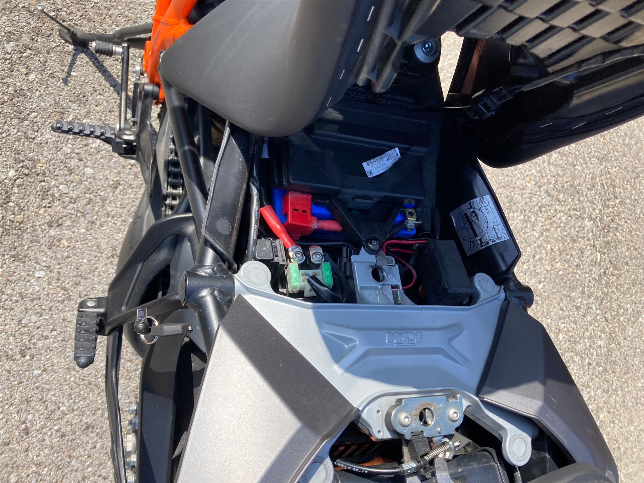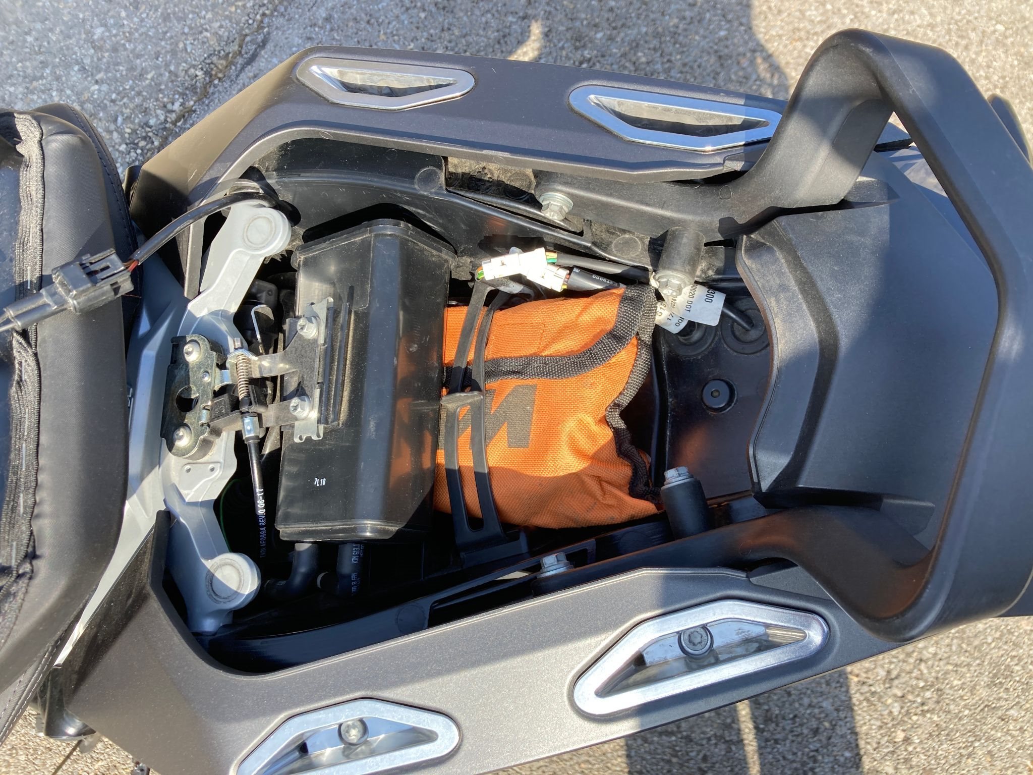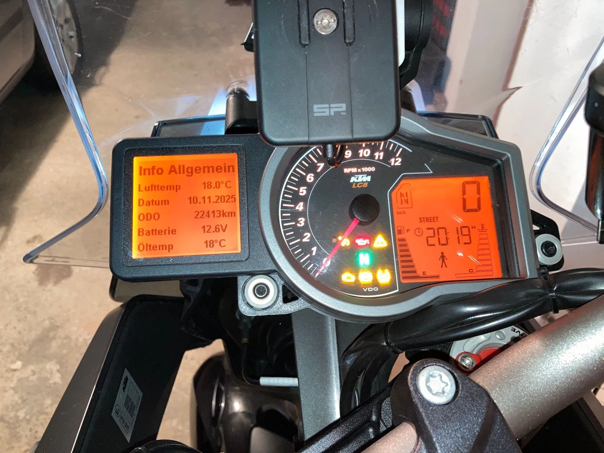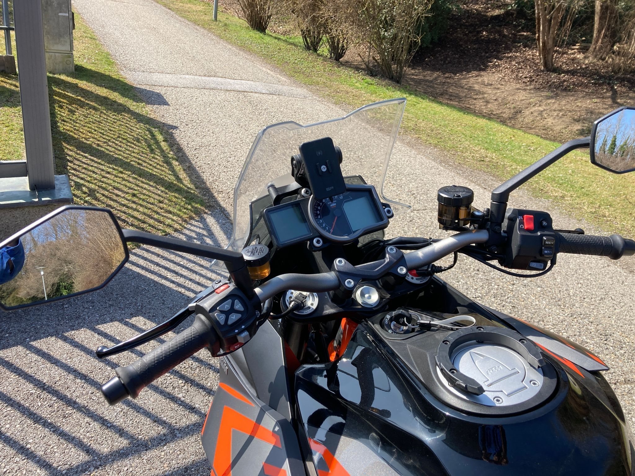 KTM GPS-Halter, darauf SP Connect Antivibration mit Wireless Charging Modul aufgebaut, versorgt über geschaltenen Plus bei Zündung ein (Zigarettenanzünderbuchse ausgebaut, kann jederzeit wieder zurückgebaut werden), mit entsprechender SP Connect Handyhülle kann selbiges somit leicht gut sichtbar montiert und gleichzeitig kabellos geladen werden)