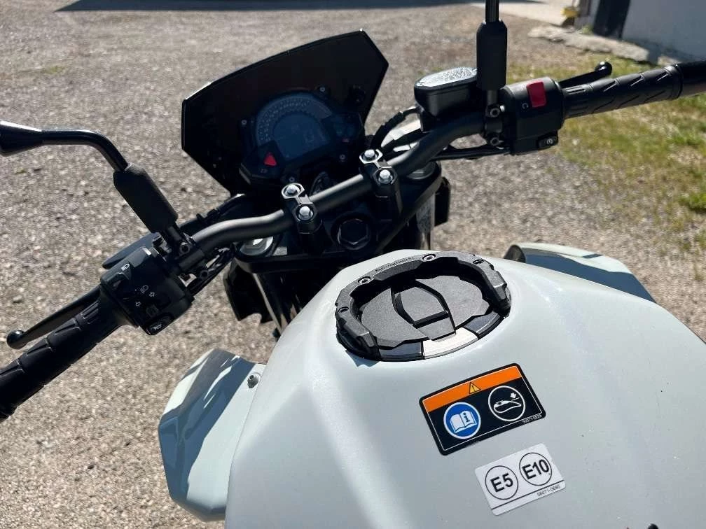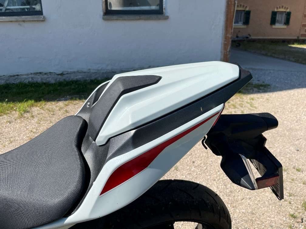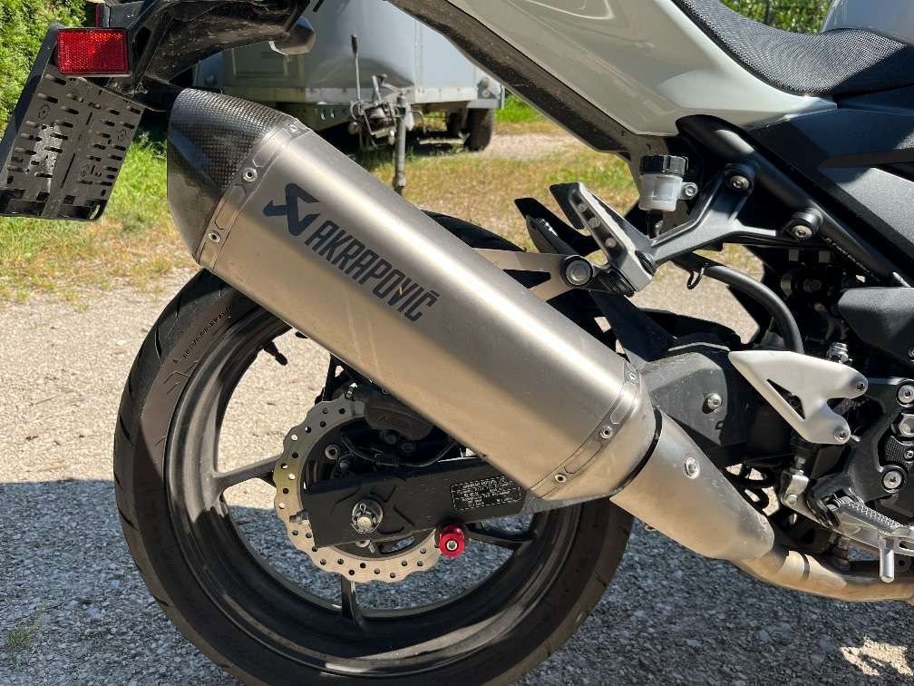 Das Motorrad hat einen Akrapovic Auspuff, seitliche Sturzpads und eine Soziussitzabdeckung statt dem Sitz.