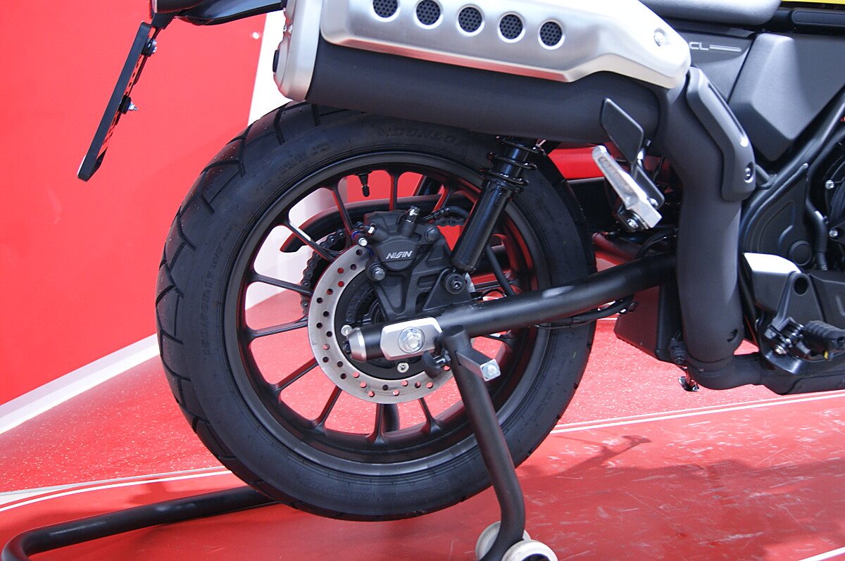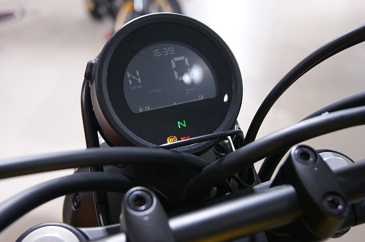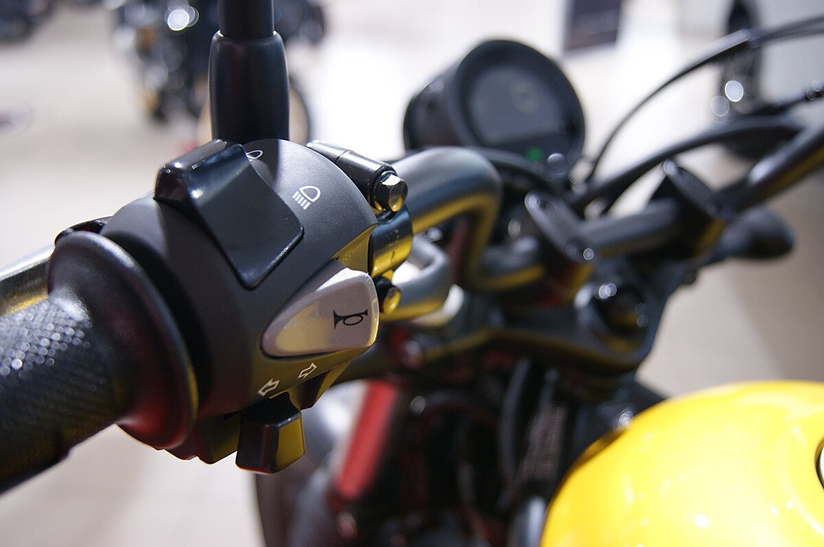 Überzeugende OptikDie ikonische Optik beginnt beim 12-l-Kraftstofftank: glatt, rund, perfekt geformt und mit bequemen Gummikniepolstern. Alle Bauteile, bei denen dies möglich ist - Motor, Rahmen und Fahrwerk - sind tiefschwarz lackiert, was das minimalistische Erscheinungsbild unterstreicht. Wie in den guten alten Zeiten sind die Gabeltauchrohre durch Faltenbälge aus Gummi geschützt. Der hohe und ausladende Lenker ermöglicht ausgezeichnete Kontrolle und harmoniert bestens mit dem hochliegenden Auspuffendtopf, der sich durch einen markanten, perforierten Edelstahl-Hitzeschild und perfekt platzierte Doppelrohre auszeichnet.