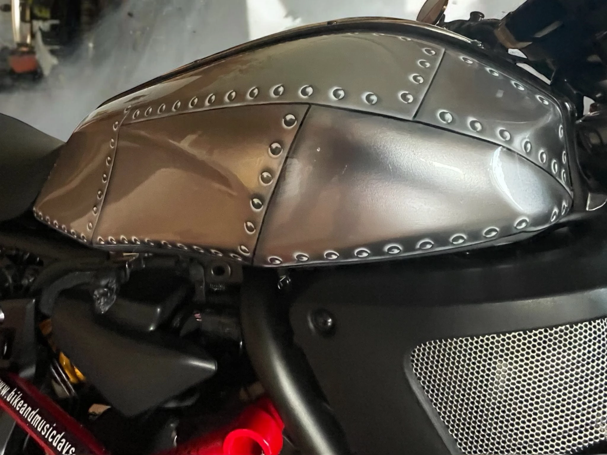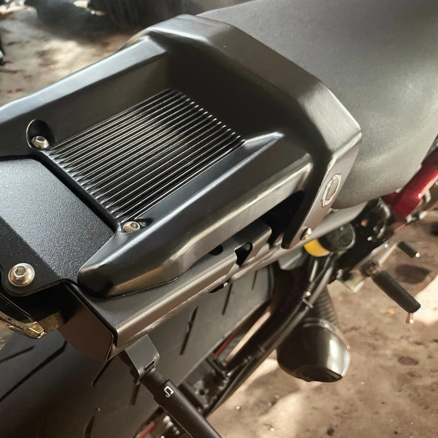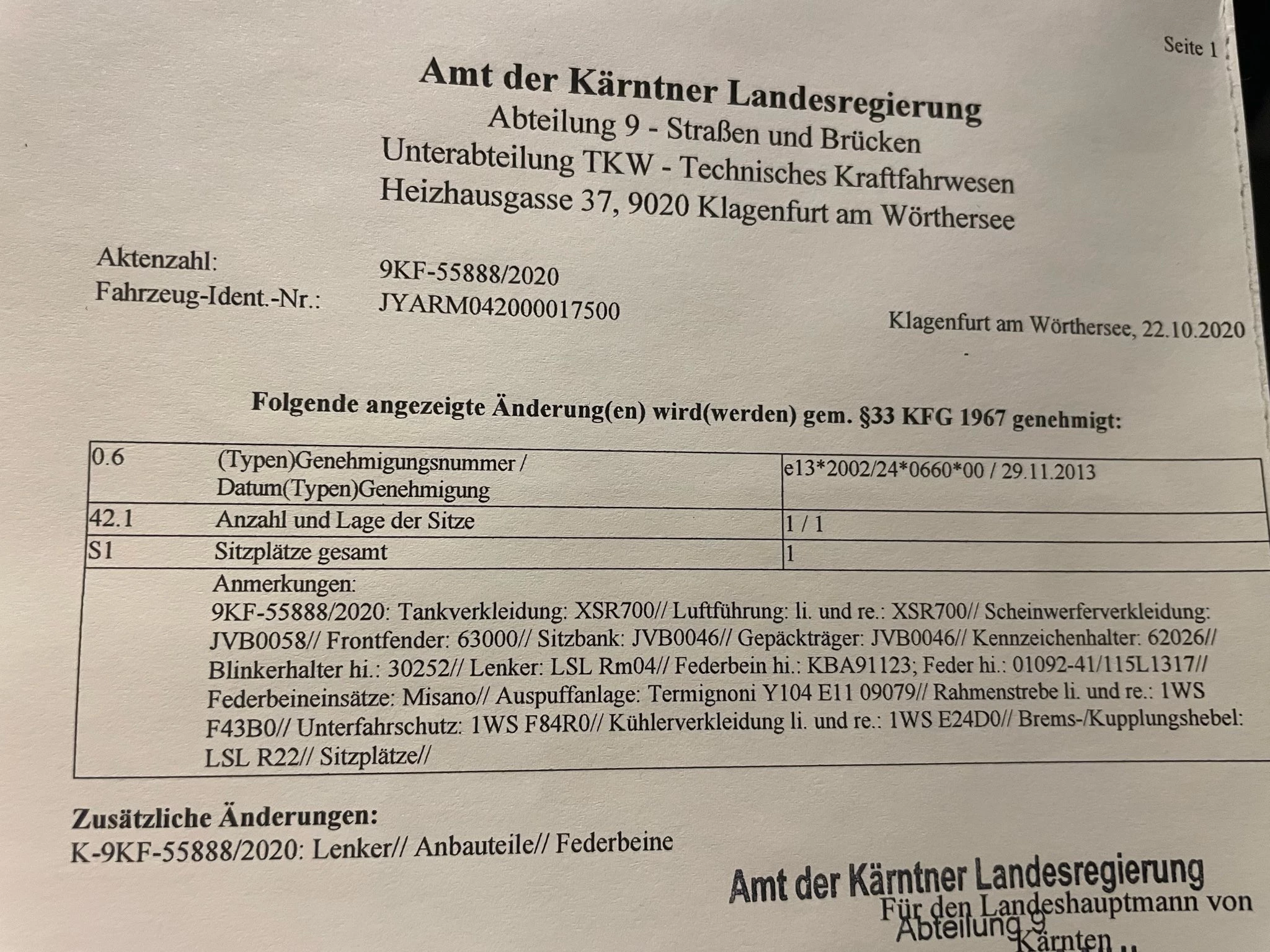 & Frontfender von Kedo verbaut. Tankverkleidung von XSR-700 verbaut mit Nietenblech-Airbrush. Termignioni Auspuff. Breiterer Lenker mit LSL Lenkerendenspiegel & Griffen plus Hebel. Dynojet + Mapping (der CP2 zieht somit besser durch). Hinten Öhlins Federbein, vorne Wilbers Misano Federn einstellbar. Moto Cage Sturzpads,etc. Alles eingetragen und typisiert!