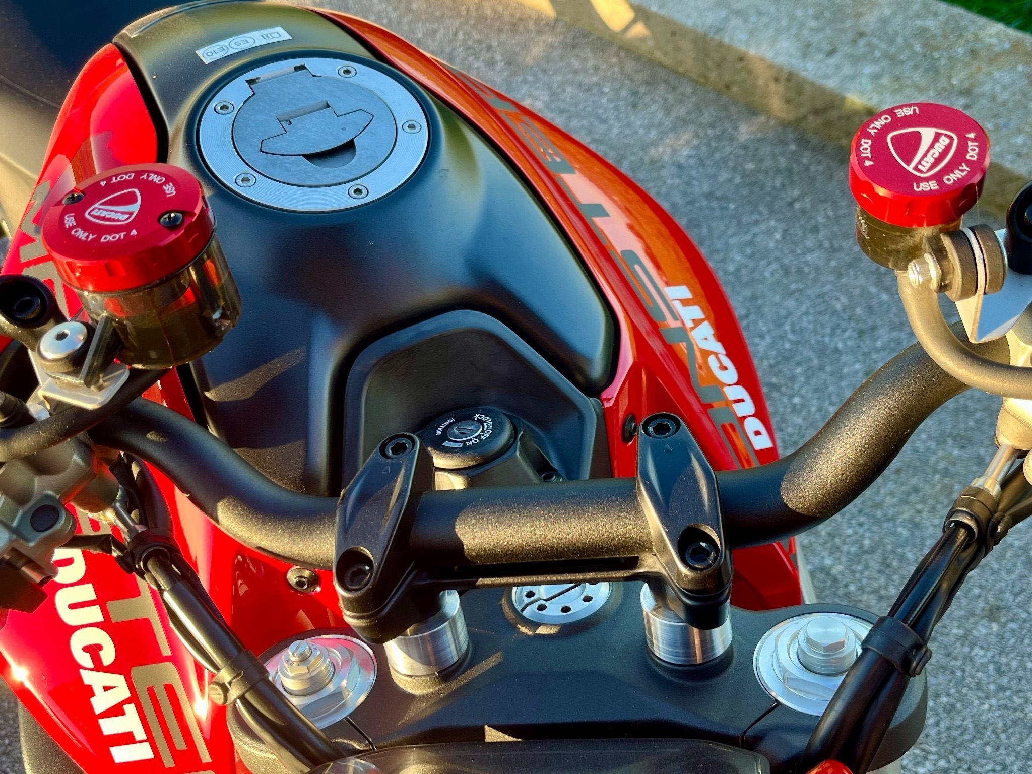 Mit dem Lenker der um 2 cm erhöht ist, den Domino Griffen und den Sturzpads vorne und hinten ergibt ALLES ein stimmiges Gesamtbild.
