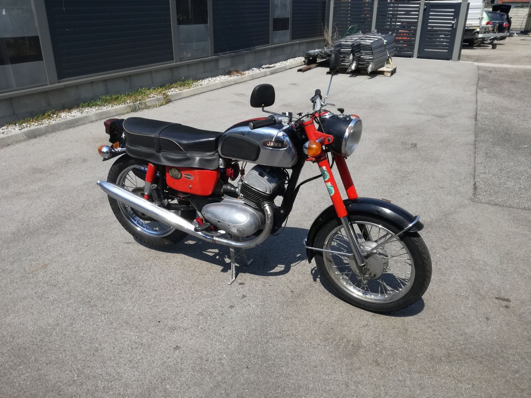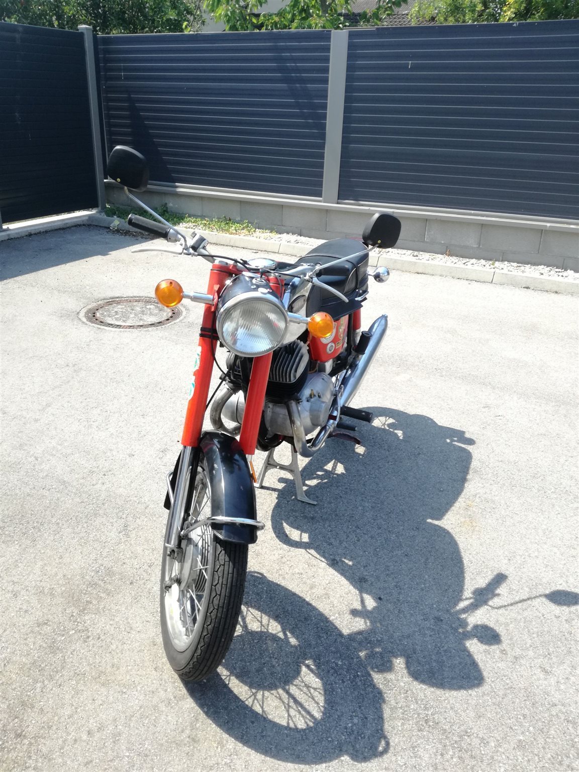 Motorrad wurde bis jetzt auf Parkplatz zum Testen etwas gefahren, jedoch müssen Kupplung, Bremsen (beides Neuteile) und der Motor (aufgrund der langen Standzeit wieder eingefahren werden.
