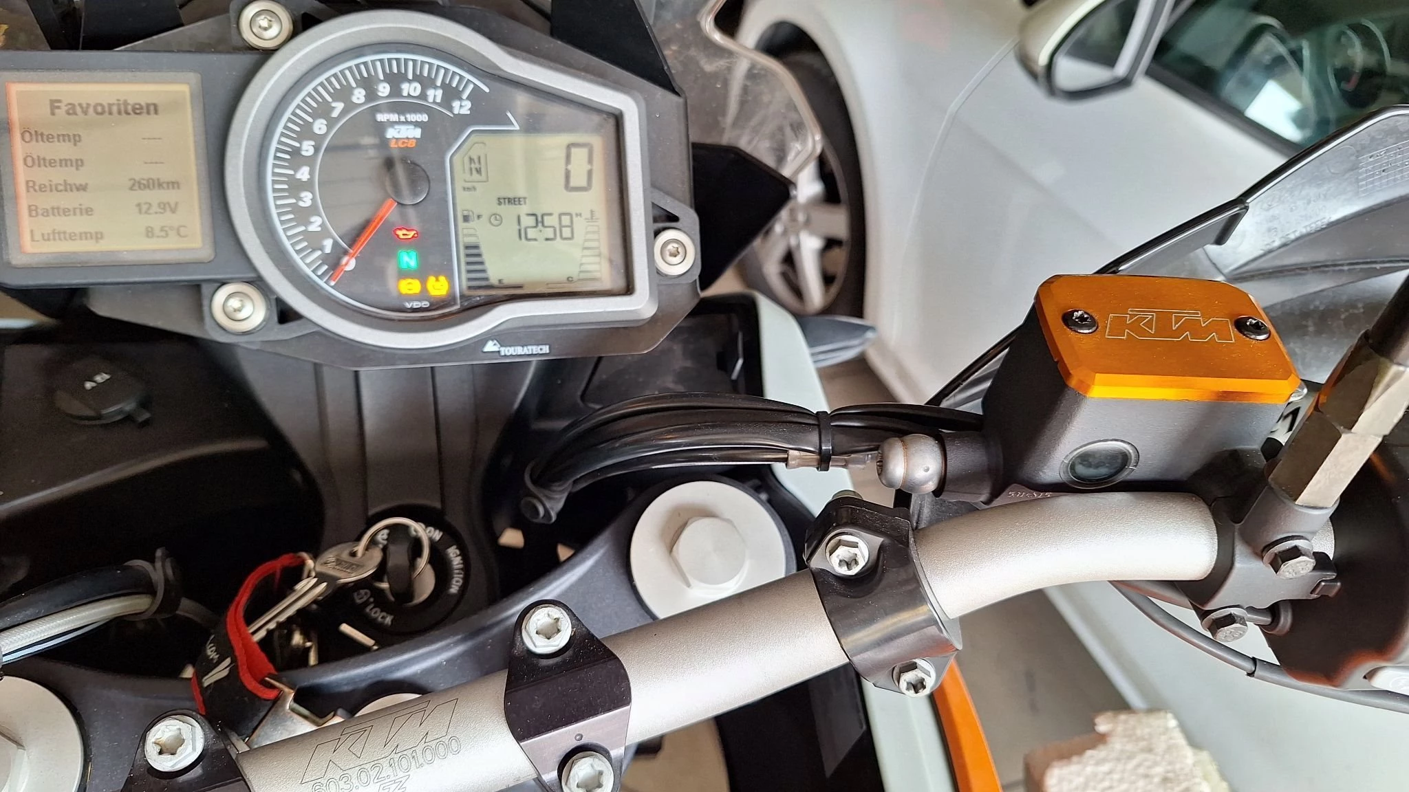 Top Zustand. Garantiert Umfall- und Unfallfrei. Neuer Hinterreifen, Vorderreifen ca. 1000km, neuer Kettensatz ca. 200km, neuer Luft- Olfilter, neues Motor- Kupplungsöl, neue Bremsflüssigkeit, neue Bremsscheibe und Beläge hinten, neue Beläge vorne, Lithium -Ionen Batterie ca. 1/2 Jahr, geteilte Sitzbank von 1190er, Seiten und Hauptständer, KTM Schutzaufkleber Tank, Hitzeschutzteile Carbonoptik, KTM Powerparts Bremsöl- und Kupplungsdeckel, Navi Garmin-Zumo 396LMT inkl. Halterung - über Zündschloss Stromversorgung. Orig. Sturzbügel.
