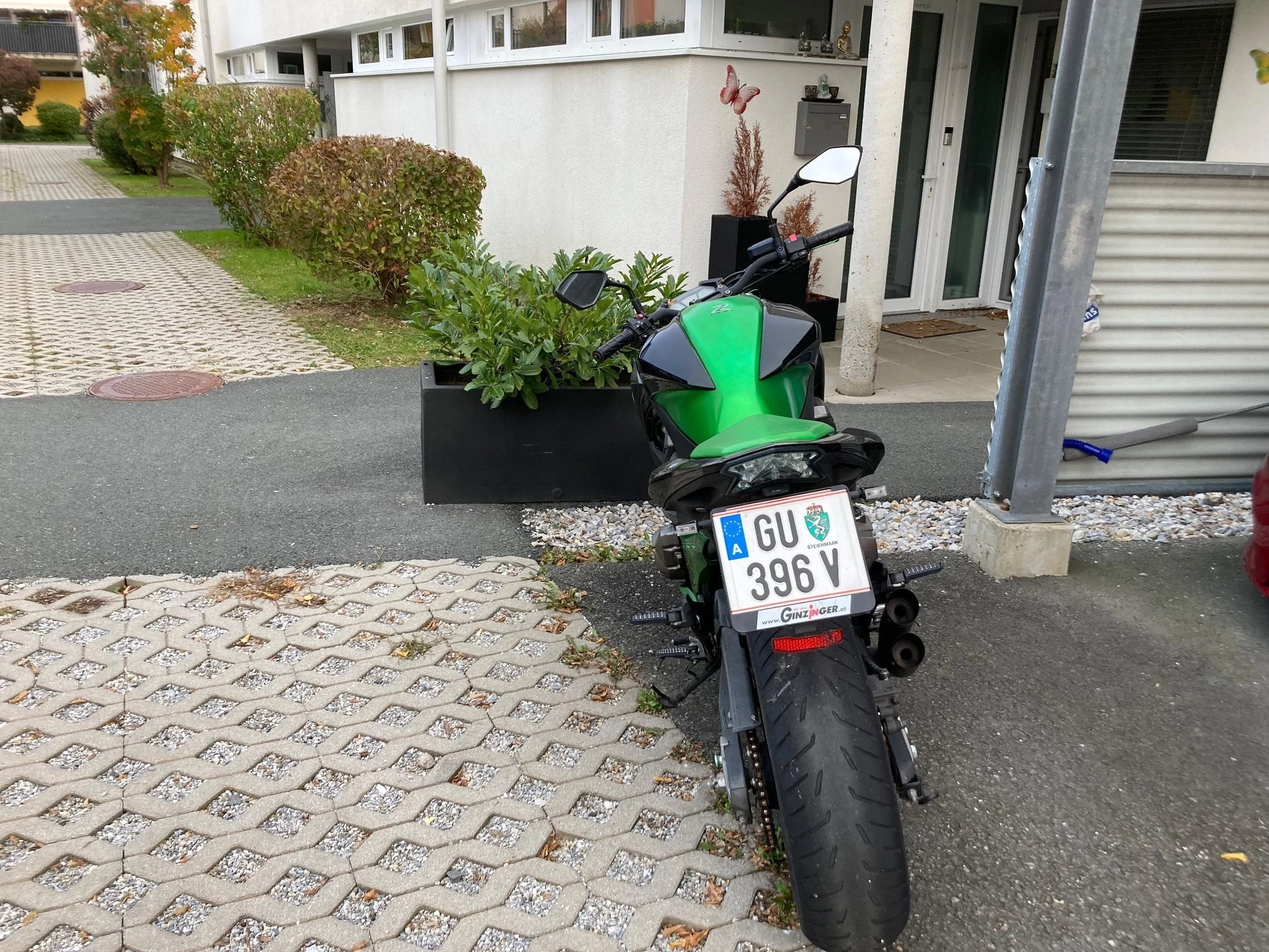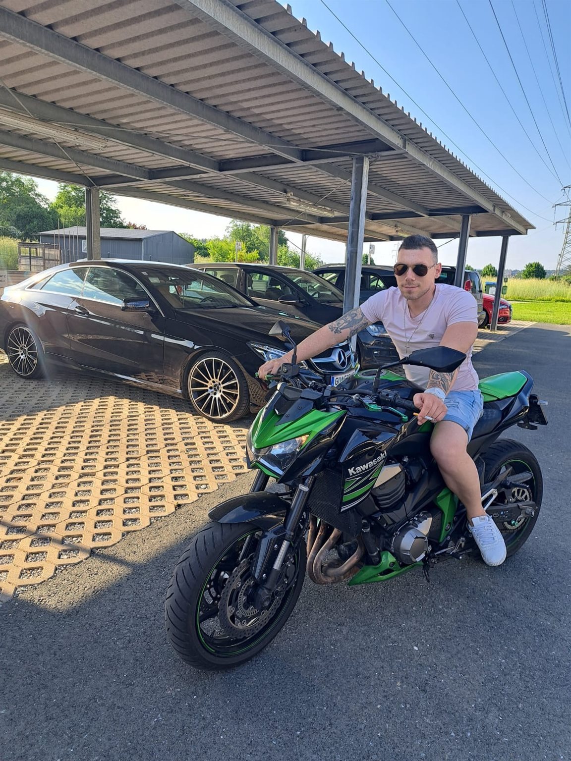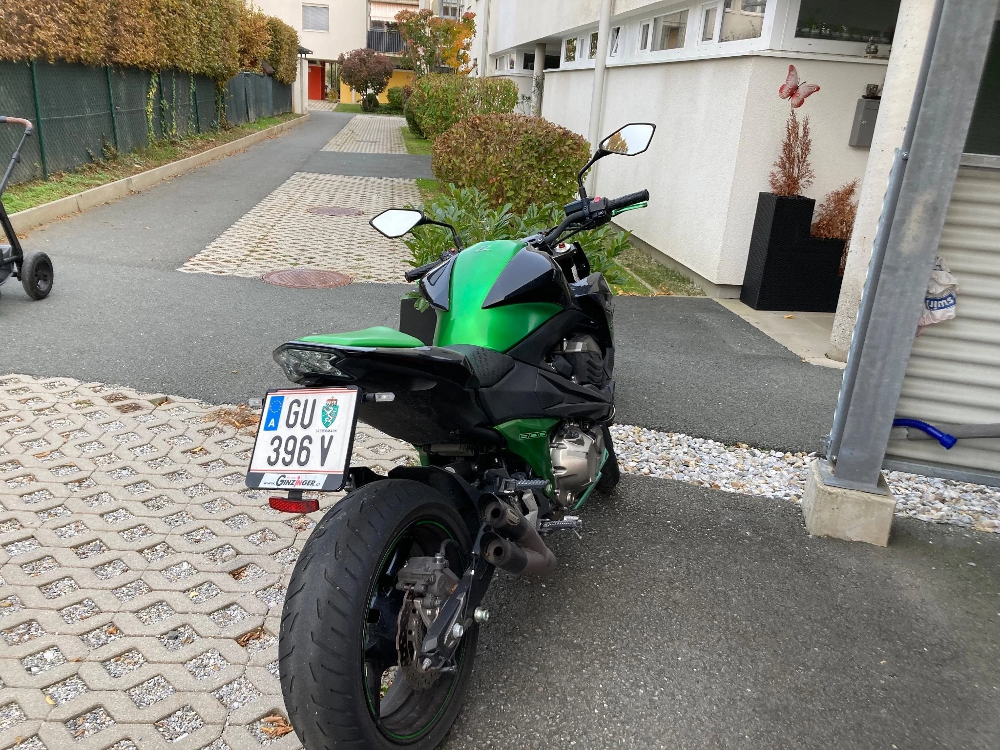 Die Kawa hat einen breiteren Lenker grün eloxierter Bremsund Kupplungshebel kürzere Ausgührung kleine Blinker vorne und hinten ein kurzes Heck und ein Hurric Sportauspuff auch kurz mit doppelschalldämpfer. Alles eingetragen.