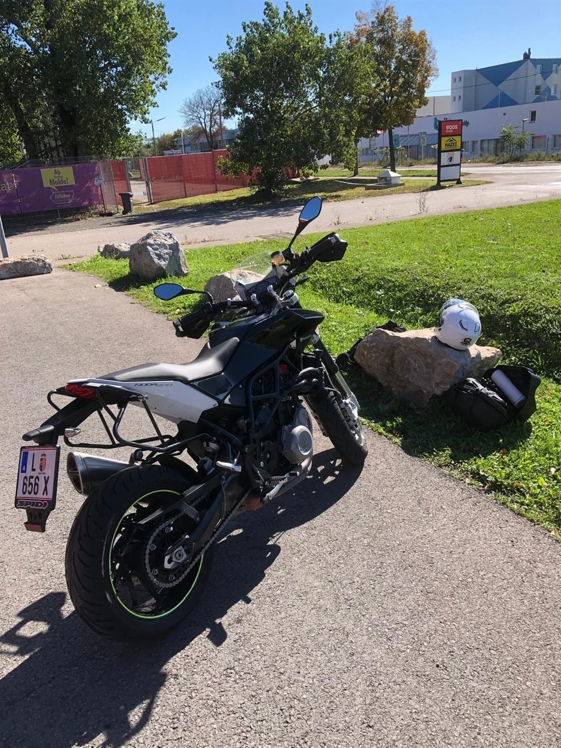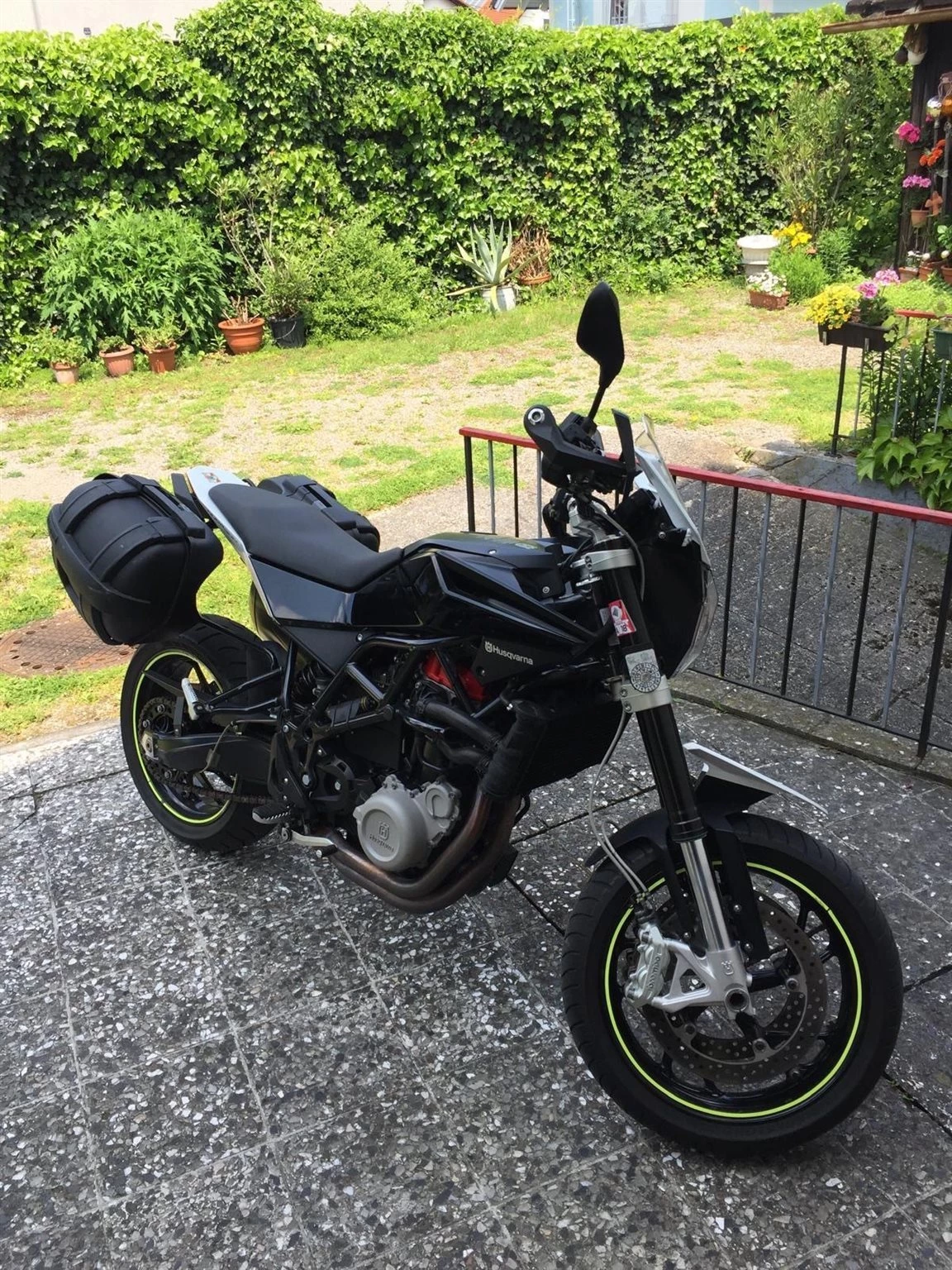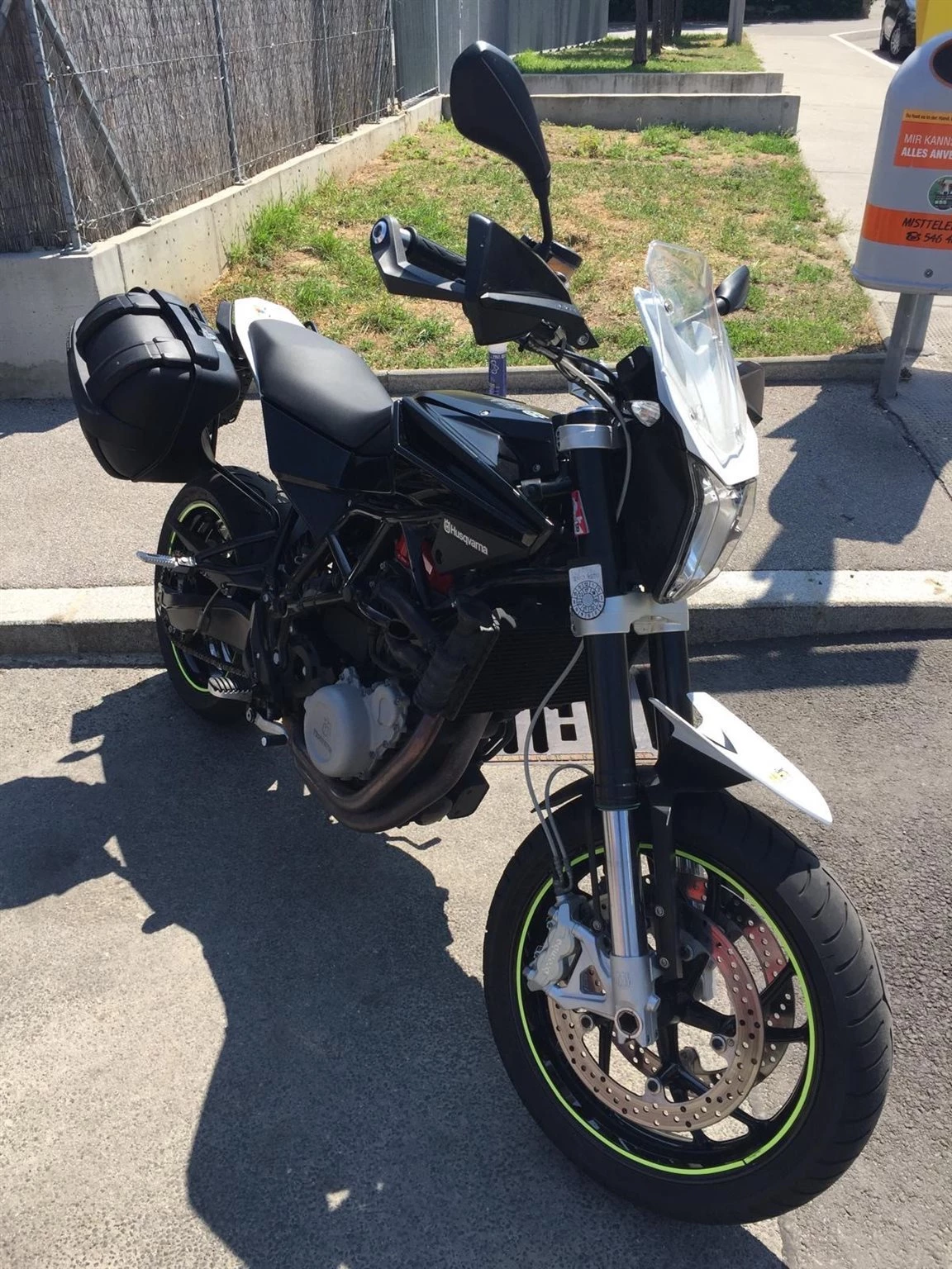 Dazu gibt es 2 original Husqvarna-Koffer, Heizgriffe, Handprotektoren, hohes Windschild, Scottoiler Kettenschmiersystem, kleineres Ritzel und Tomtom-Navi.