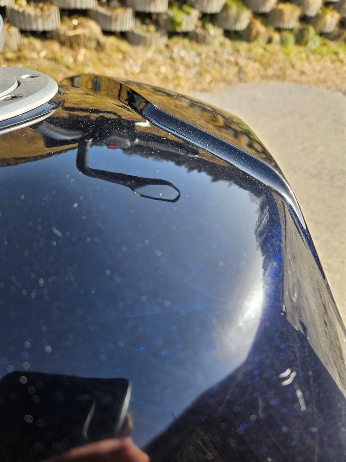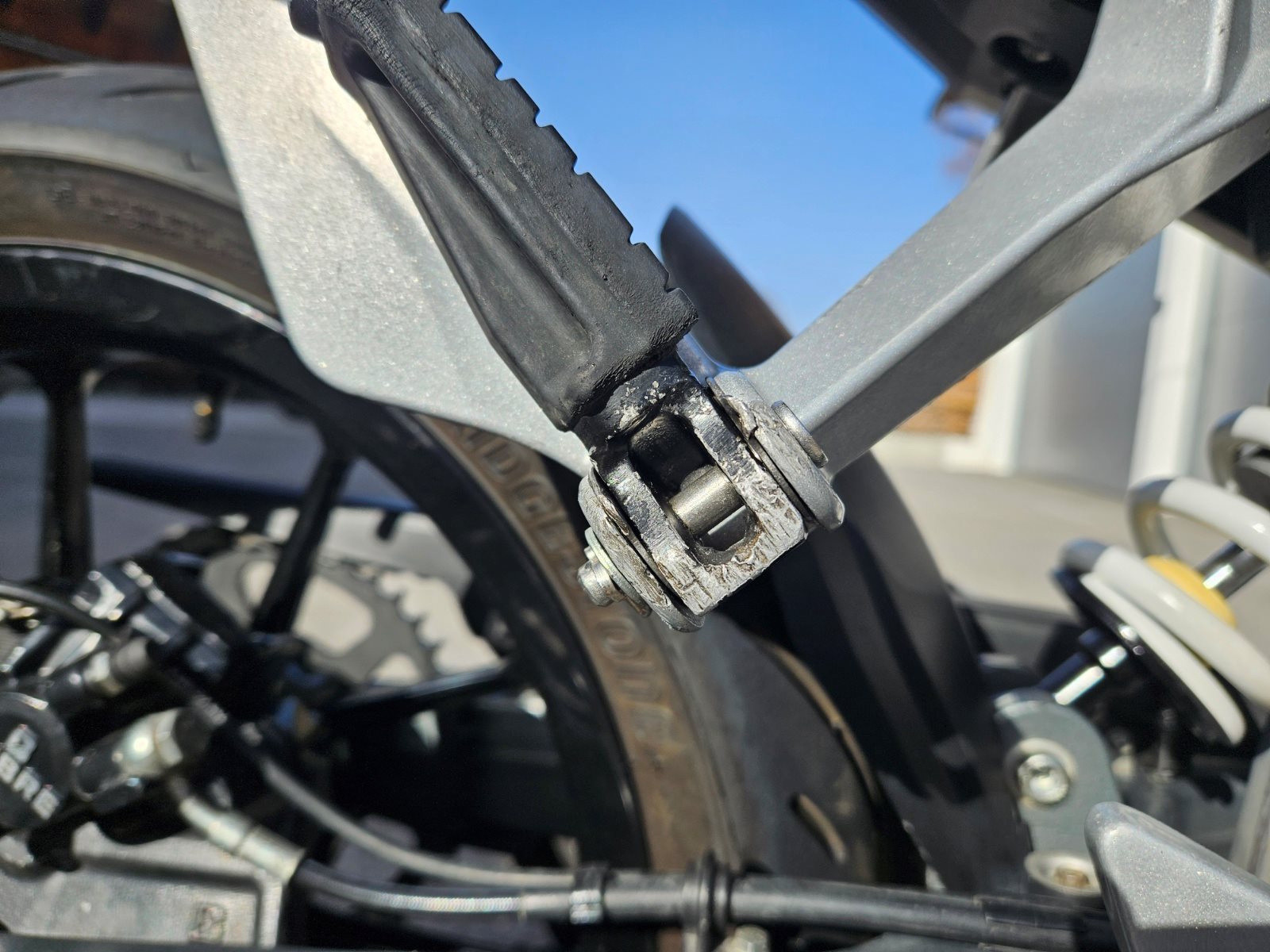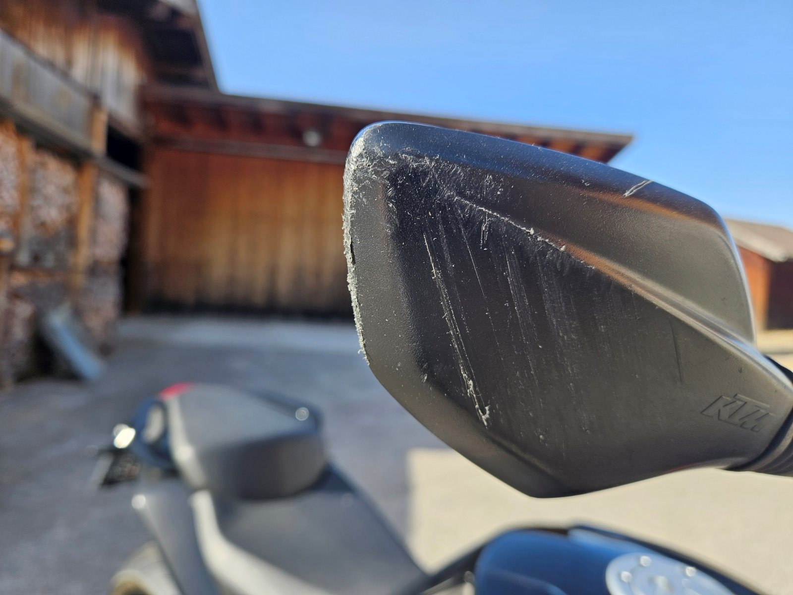 Mein Vorbesitzer hatte leider einen kleinen Rutscher weshalb leichte Schäden an der rechten Soziusraste und dem rechten Spiegel vorhanden sind.