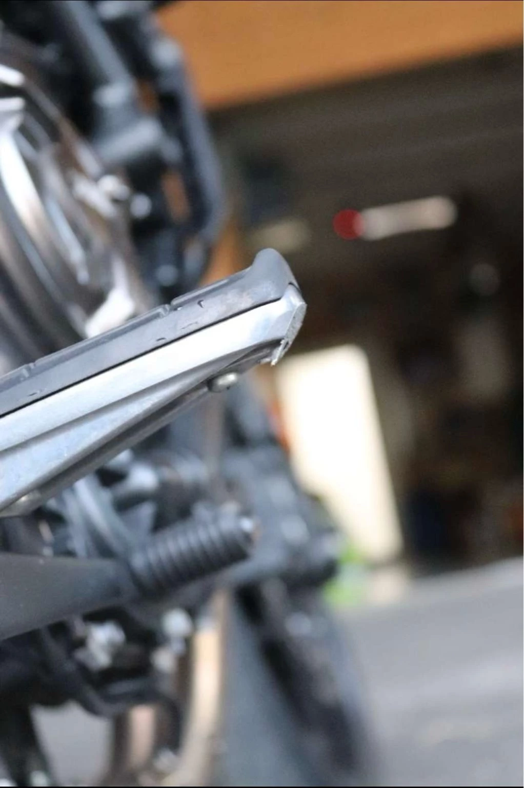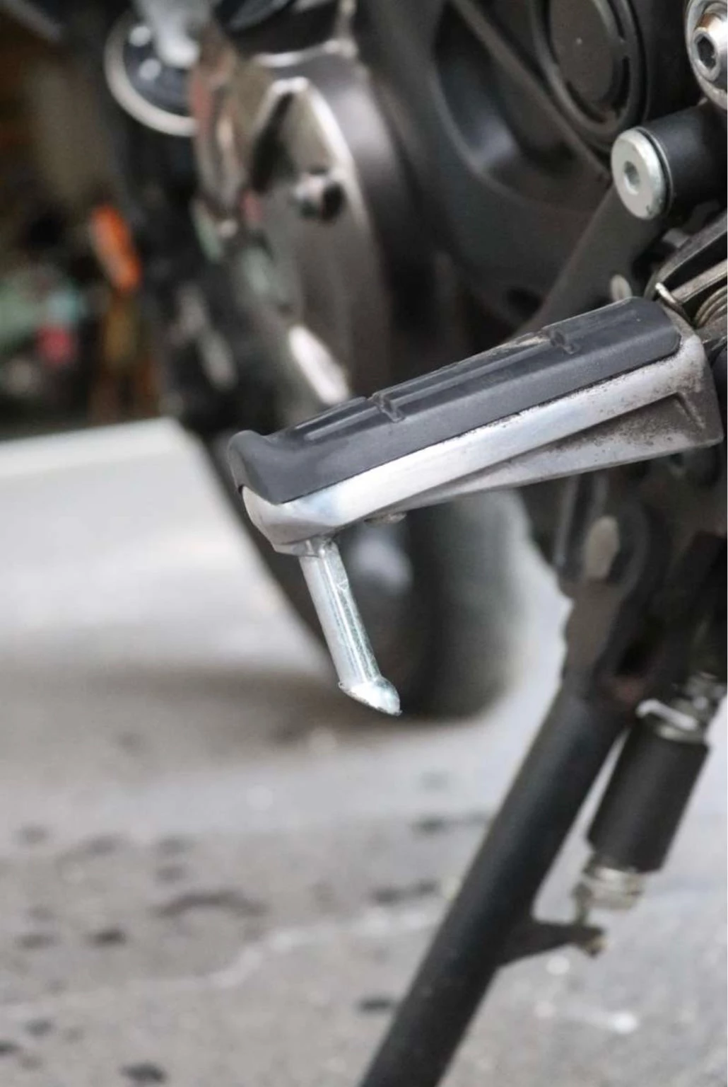 Leider ist das Motorrad dem Vorbesitzer einmal auf die rechte Seite umgefallen. Dabei wurde das Plastik beim Yamaha-Logo leicht zerkratzt und der Fußrastenschleifer ist abgebrochen (Gewinde ist jedoch in Ordnung). Ich habe keinen Bedarf gesehen, das zu ersetzen.