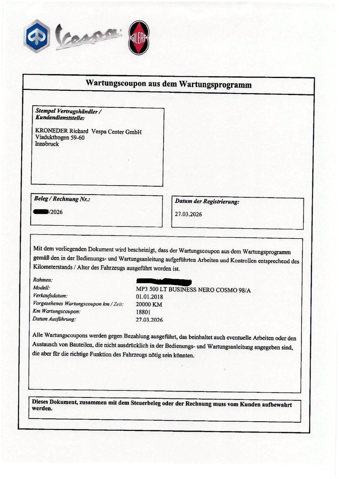 Am 27.03.2026 wurde bei der Firma Vespa Kroneder in Innsbruck bei KM 18.801 vorab das große KM 20.000 Service durchgeführt, und natürlich auch im Service-Buch sowie im Piaggio/Vespa Wartungsprogramm eingetragen und vermerkt. (siehe Fotos)