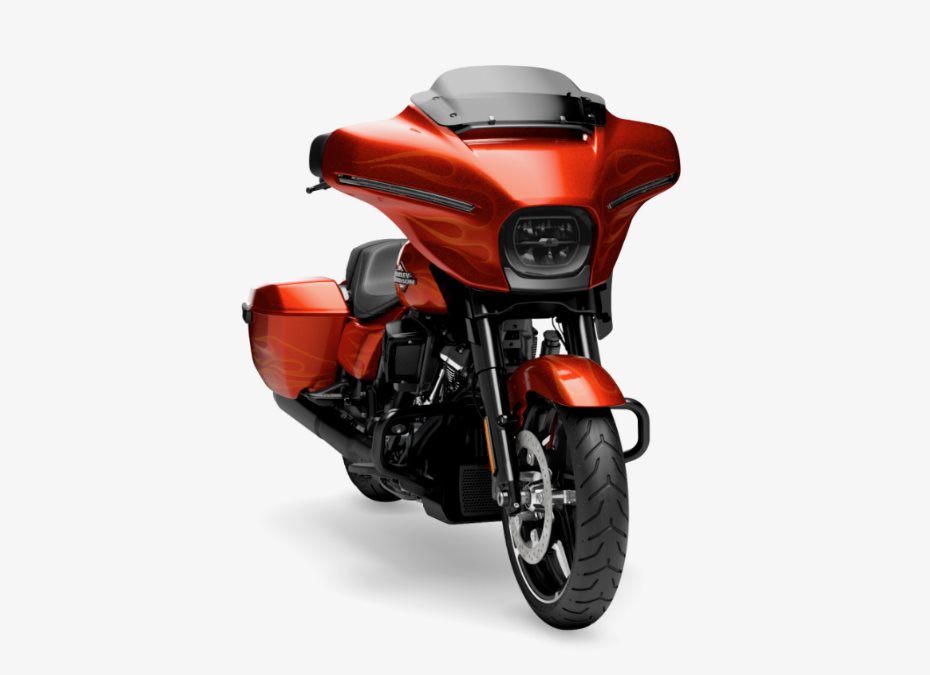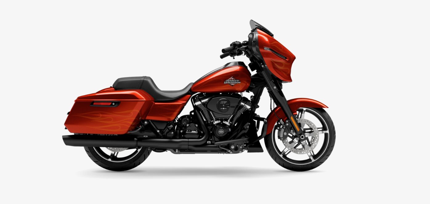 Wunderschöne Street Glide im limitierten Whiskey Firestorm - ein kräftiges Orange mit dezenten orangen Flammen in Kontrastfarben.