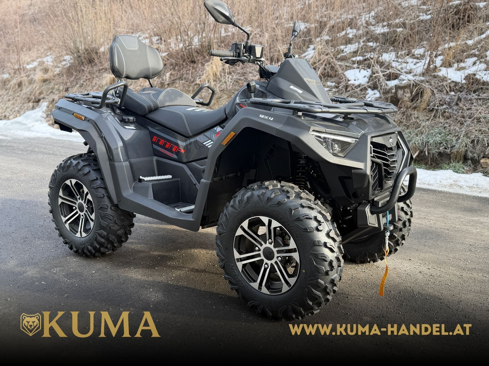 Das elektrische Servolenkungssystem (EPS) sorgt für präzises und ermüdungsfreies Handling, während die Einzelradaufhängung (doppelte Querlenker vorne, geschmiedete Längslenker hinten) höchsten Fahrkomfort garantiert. 27-Zoll-Reifen mit aggressivem Profil, eine Bodenfreiheit von 285 mm und die robuste Bauweise machen das ATV zu einem echten Geländemeister.