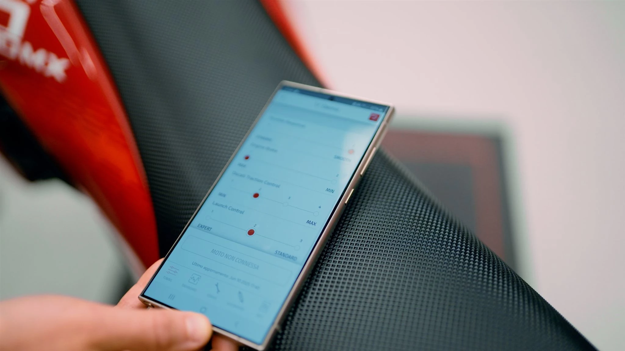 Damit entstand die Cross Link App, die Wartungsdaten, Fahrstile und Einstellungen verknüpft. Giulia Lotti, Projektmanagerin für Elektronik, erklärt: "Da das Bike kein Display hat, ist die App die Schnittstelle zwischen Fahrer und Maschine. Sie passt die Wartungsintervalle an und erlaubt das Tuning von Gasannahme, Traktionskontrolle, Launch Control und gibt abhängig von eingetragenem Fahrergewicht und Fahrkönnen Vorschläge für die Fahrwerks-Einstellung."