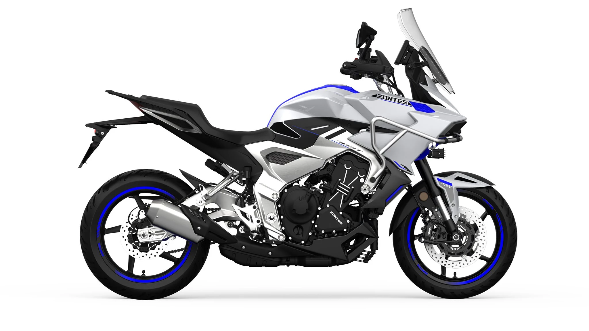 Mit einem Radstand von 1.480 mm, einer Sitzhöhe von 790 mm und einem Gewicht von 206 Kilogramm wirkt die ZT703-T tourenorientierter als die R-Version. Der 20-Liter-Tank soll Reichweitenvorteile bieten. Gebremst wird vorne und hinten mit ABS-unterstützten Scheibenbremsen, die Reifen messen 120/70-17 vorne und 180/55-17 hinten.