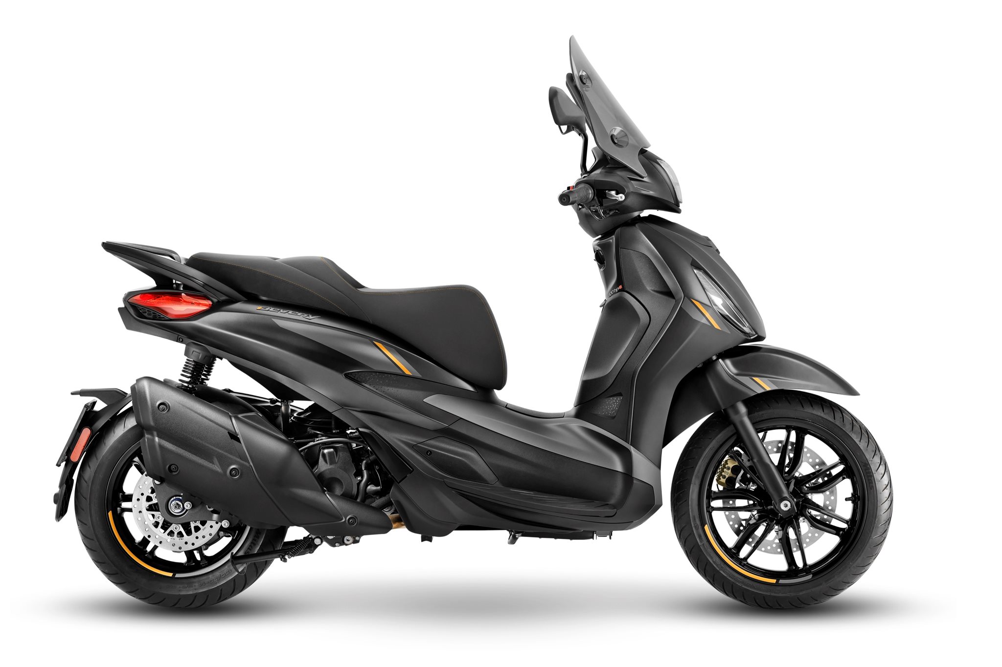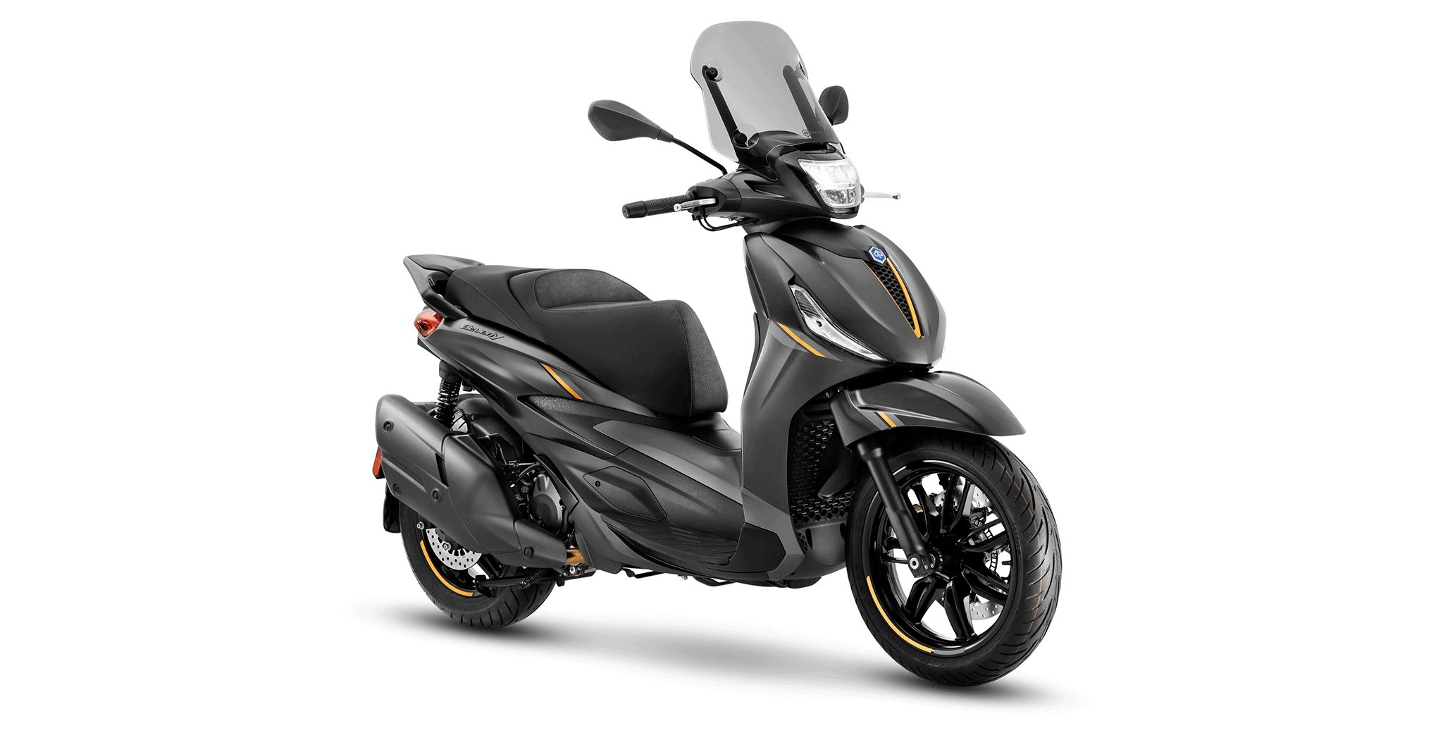 Die Jubiläumsausgabe zeige sich in einer exklusiven Farbvariante "Grigio 25th Anniversary", einem dunklen, matten Metallic-Grau. Eine hellgraue Grafik ziehe sich von den hinteren Seitenteilen über den Beinschild bis zum vorderen Kotflügel und erinnere an die Linienführung des ersten Beverly aus den frühen 2000er-Jahren.