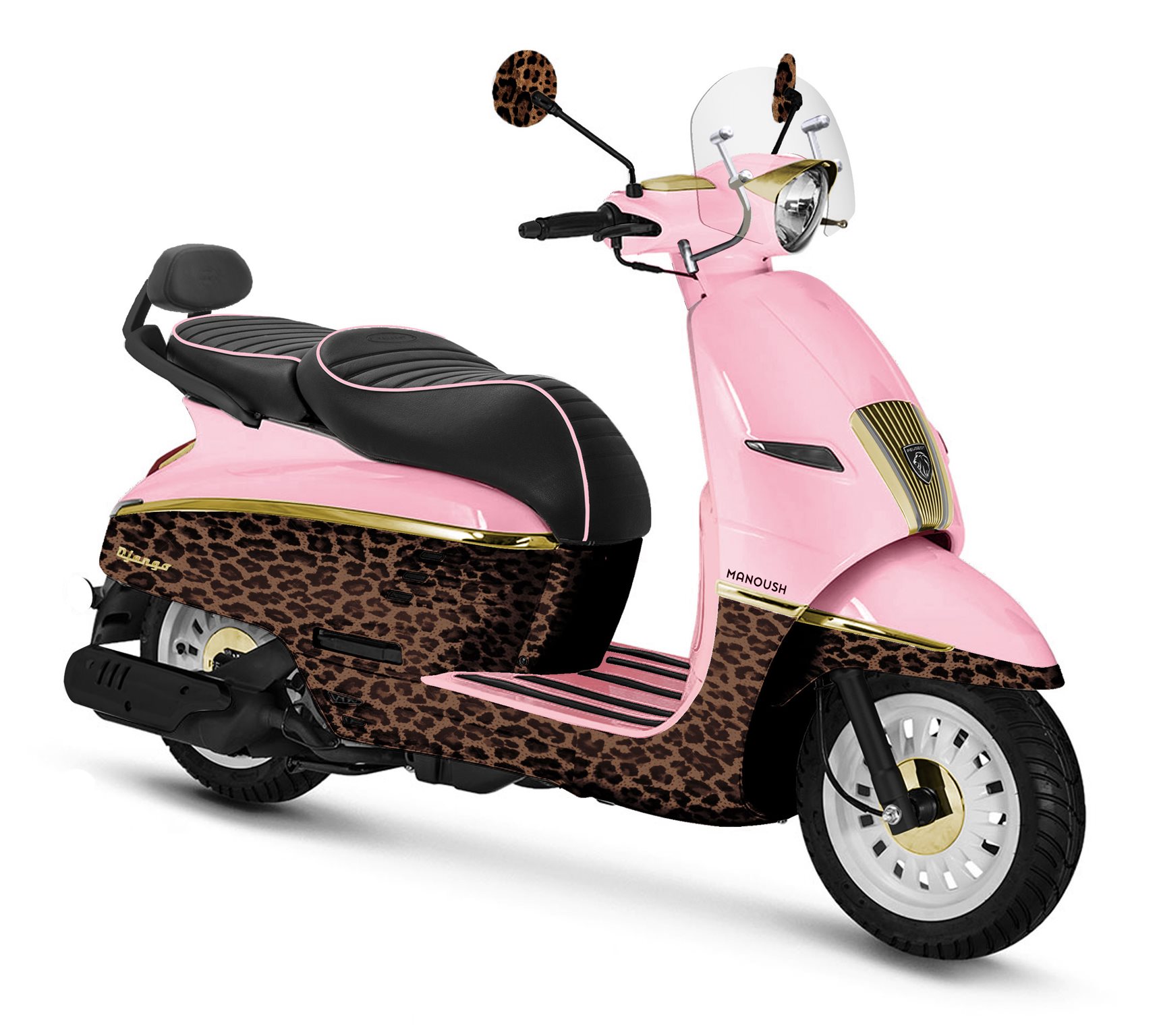 Optisch soll der Peugeot Django Manoush durch seine maßgeschneiderte Lackierung in Pink mit Leopardenmuster und goldene Designelemente auffallen. Der Sitz im Couture-Stil, die Rückenlehne für den Beifahrer und eine kurze Windschutzscheibe seien serienmäßig. Jedes Exemplar werde zudem mit einer Manoush-Handtasche in passenden Farben ausgeliefert. Damit richte sich die Edition klar an Designliebhaberinnen, die auch auf zwei Rädern ihren Geschmack zeigen wollen.