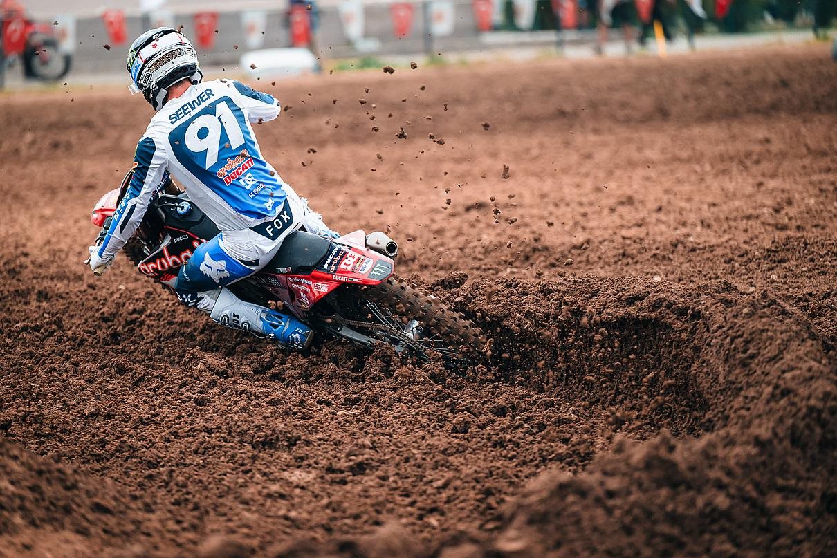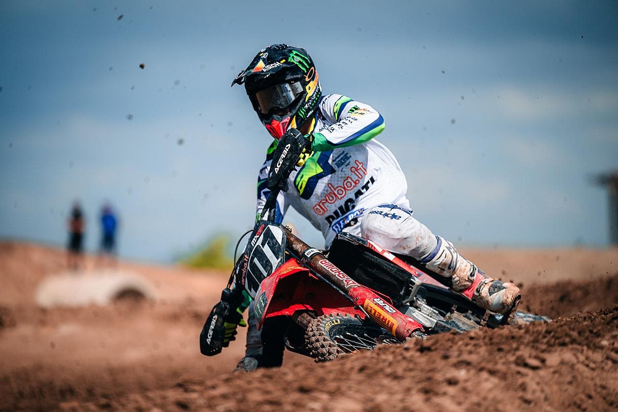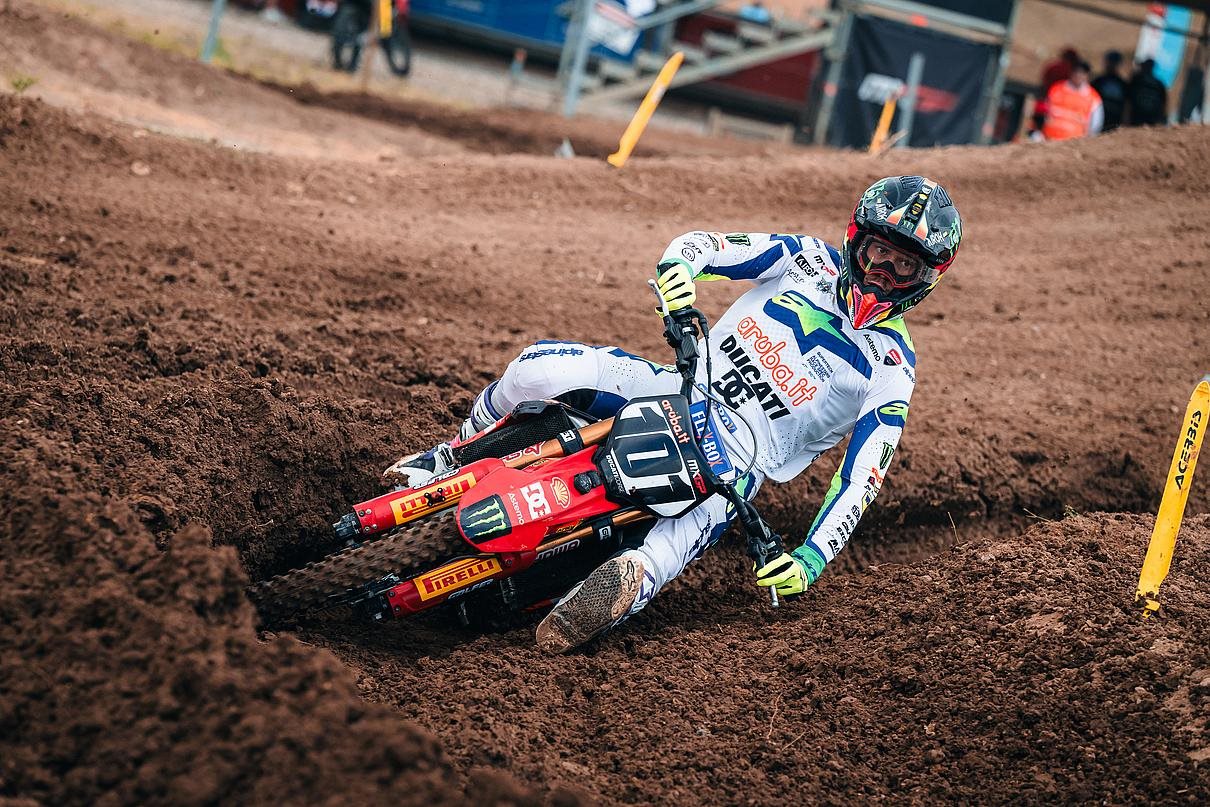 Das zweite Rennen begann weniger positiv, da die beiden Ducati-Fahrer außerhalb der Top 15 landeten. Mattia, der in der ersten Runde auf Platz 16 liegend stürzte und als Letzter neu startete, Jeremy lag zu Rennbeginn auf Platz 20. Der Italiener stürzte nach zwei Runden erneut, beschädigte sein Desmo450 MX-Motorrad und musste in die Box, um eine Runde hinter dem Feld wieder ins Rennen zu gehen. Der Schweizer Fahrer startete unterdessen eine aufgrund der Streckenbedingungen anspruchsvolle Aufholjagd, die ihn vom zwanzigsten auf den sechzehnten Platz brachte. Auch Guadagnini holte Punkte und fuhr trotz seines beschädigten Motorrads mit hohem Tempo auf den 20. Platz.