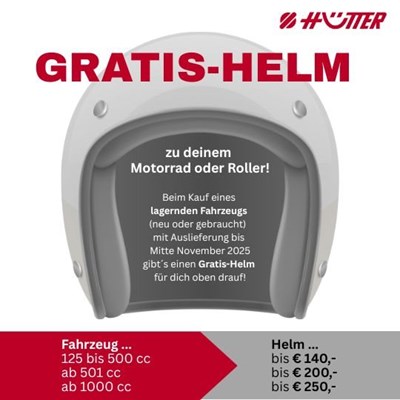 Aktion gültig bis Ende Oktober 2025 bei Fahrzeug-Auslieferung bis 14. November 2025. Solange der Vorrat reicht. Gilt für lagernde Fahrzeuge und lagernde Helme. Aufzahlung auf teureren Helm möglich. Nicht mit anderen Aktionen kombinierbar.