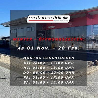 Wichtigste Änderung ist ... der Montag bleibt geschlossen und unser Standort in Graz (Werkstatt) bleibt zu dem auch am Samstag geschlossen! Auch wenn die kommenden Monate ruhiger und kälter werden, sind wir weiterhin für euch da und nehmen uns ausreichend Zeit für Beratung, Service und Werkstattarbeiten damit dein Bike perfekt durch den Winter kommt!