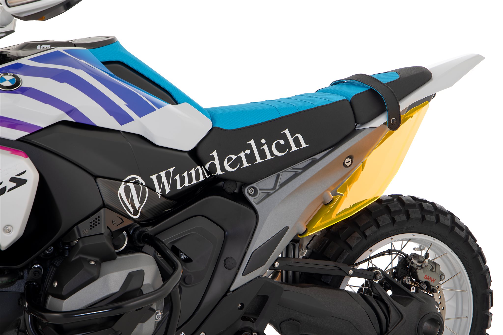 Die pieksauber integrierten Startnummerntafeln sind, genau wie das Cover für die beiden über dem Hauptscheinwerfer positionierten Zusatzscheinwerfer, aus transparentem, gelbem Kunststoff gefertigt. Ungewöhnlich aber absolut stimmig. Als Blickfang nehmen sie dem Bike die Wucht und lassen es leichter wirken. Kompromisslos dagegen ist die geradlinige Offroad-Sitzbank. Sie verzichtet konsequent auf jede Kontur und erlaubt dem Fahrer die perfekte Kontrolle und intuitive Bewegungsfreiheit für jede Sitz- und Stehposition im Gelände.