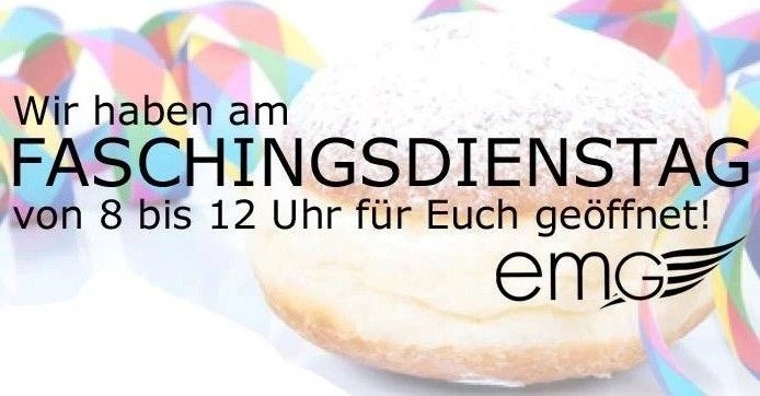 Wir haben am Faschingsdienstag von 8 bis 12 Uhr für Euch geöffnet!Faschingsdienstag 8-12 Uhr geöffnet