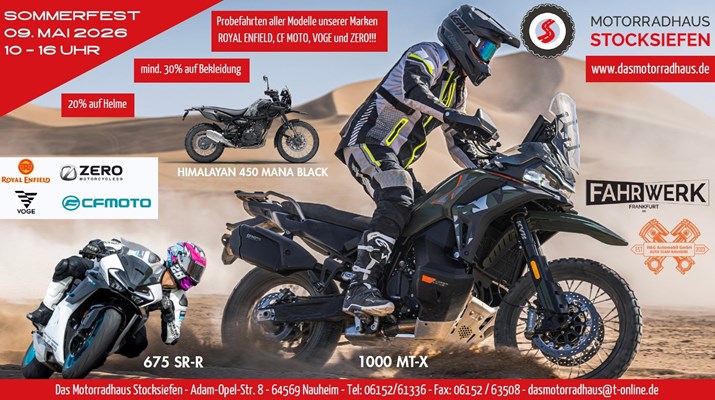 Am 9. Mai 2026 lädt das Motorradhaus Stocksiefen aus Nauheim zu seinem alljährlichen Sommerfest ein. Zusammen mit H&G Automobile Autohandel und Werkstatt auf der gegenüberliegenden Straßenseite öffnet der Royal Enfield-, Voge-, CFMOTO- und Zero-Händler um 10 Uhr seine Tore.