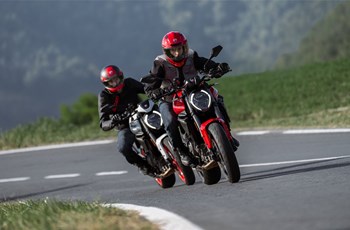 Der Ducati Monster + mit ihrem 4-Takt 90 Grad V 2-Zylinder-Motor mit Einspritzung und einem Hubraum von 890 Kubik steht die Ducati Monster mit ihrem 4-Takt 90 Grad V 2-Zylinder-Motor mit 937 Kubik gegenüber.