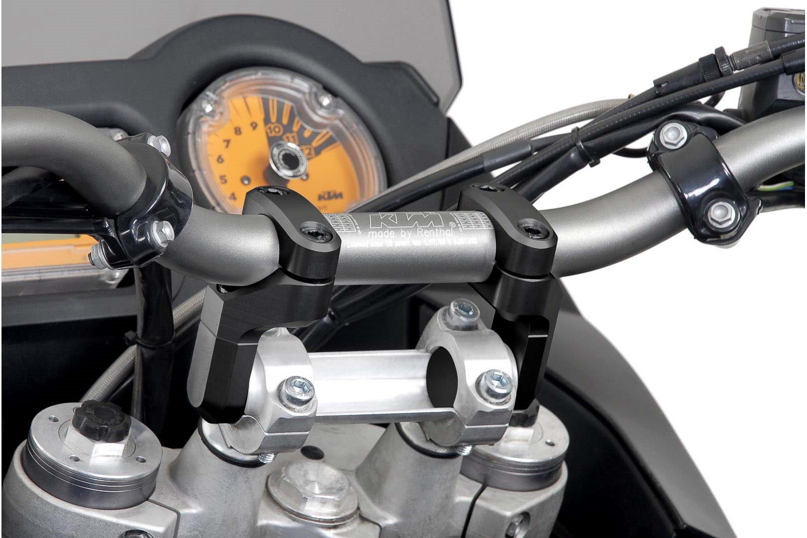 Die schwarz eloxierten Vario-Verlegungen, aus robustem, CNC-gefrästem Aluminium für 28 mm-Lenker, ermöglichen eine Verlegung von 50 mm, mit Distanzstück sogar von 60 mm, zur ursprünglichen Lenkerposition.