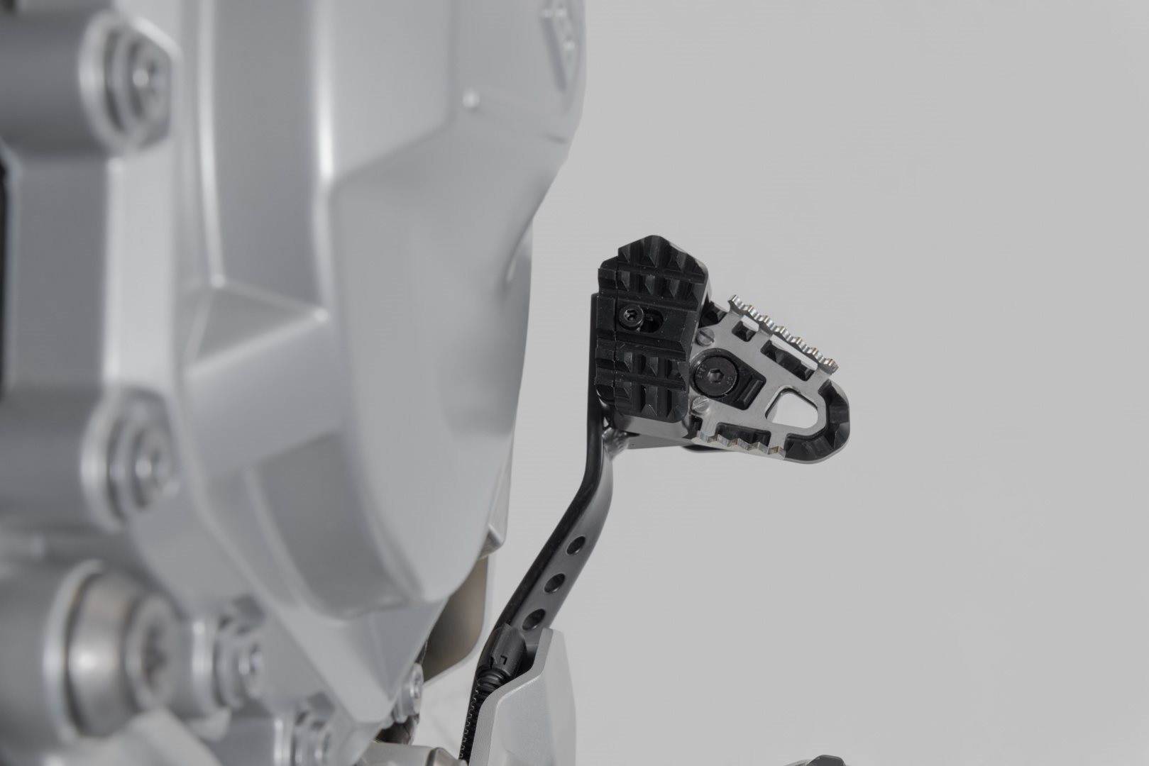 SW-MOTECH fertigt die Erweiterungen aus gefräster und hochfester Aluminiumlegierung mit schwarz eloxierter Oberfläche und mit einem Auftrittsblech in Edelstahl. Für eine optimale Anpassung an die Ergonomie lässt sich die Erhöhung des Bremshebelauftritt in zwei Stufen von 22 oder 27 Millimetern einstellen.