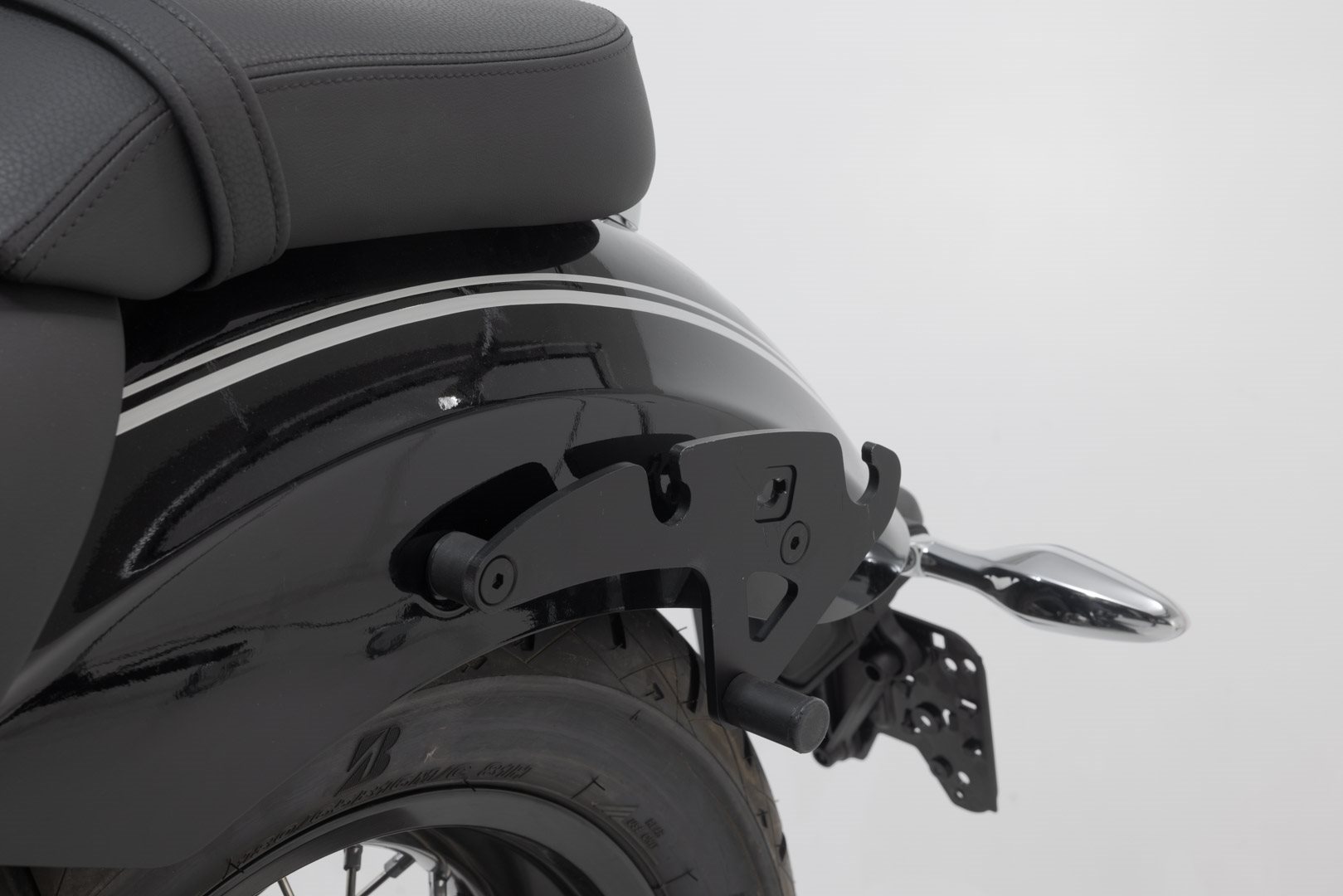 Der modellspezifische Taschenträger wird an original Anbaupunkten des Fenderstruts einfach und schnell montiert. Über ein Schnellverschluss-System lässt sich die Legend Gear Seitentasche LH mit wenigen Handgriffen anbringen und abnehmen, ohne dass der Fahrer auf eine zuverlässige Taschenbefestigung verzichten muss.