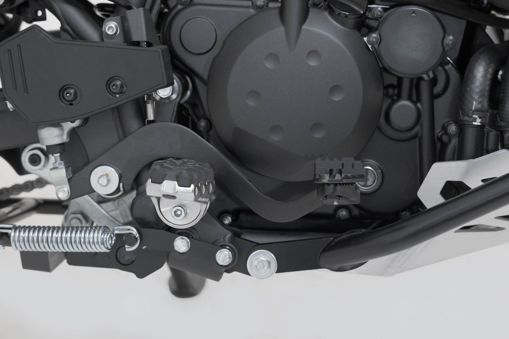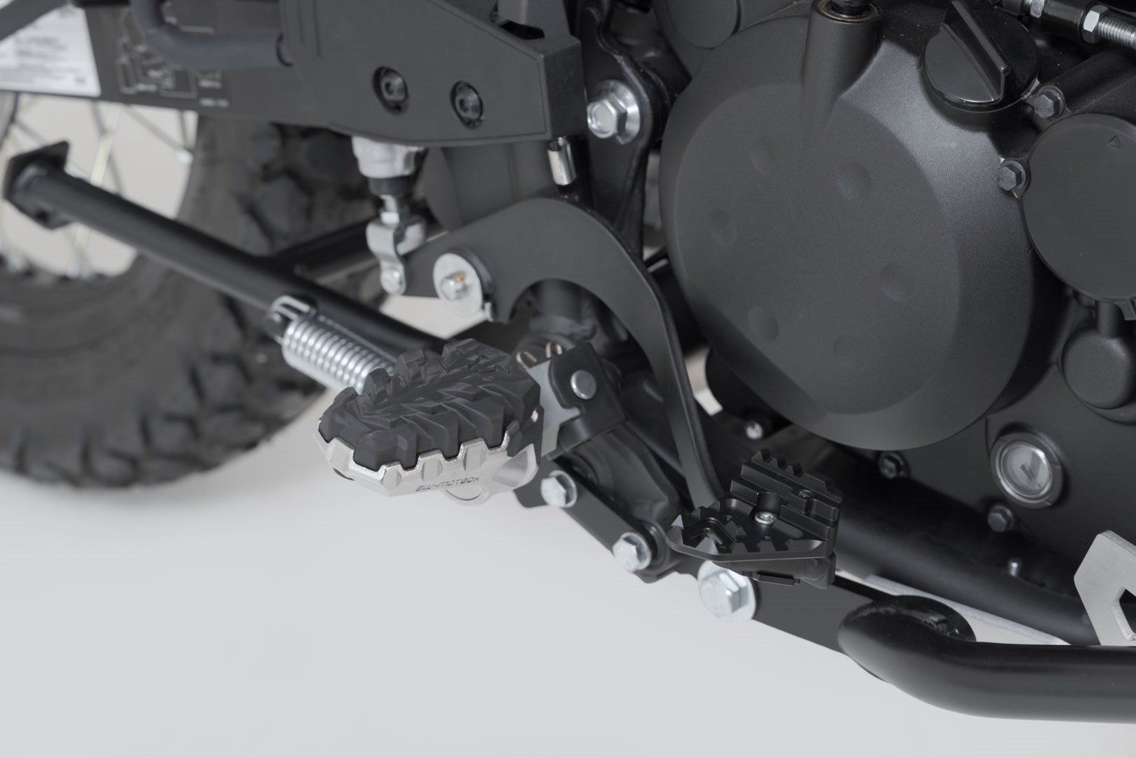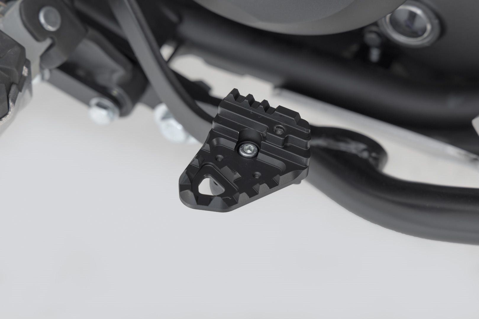SW-MOTECH fertigt die Erweiterungen aus gefräster und hochfester Aluminiumlegierung mit schwarz eloxierter Oberfläche und mit einem Auftrittsblech in Edelstahl. Für eine optimale Anpassung an die Ergonomie lässt sich die Erhöhung des Bremshebelauftritt in zwei Stufen von 22 oder 27 Millimetern einstellen.