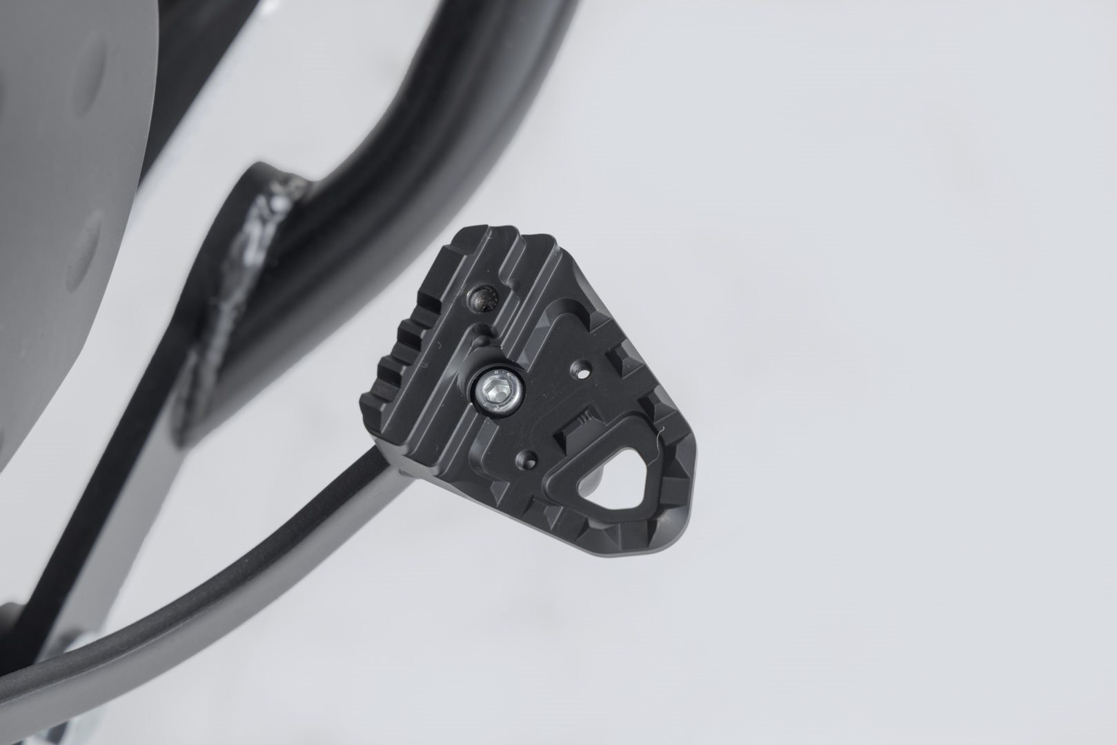 Zusätzlich zur Erhöhung verfügt die Fußbremshebel-Erweiterung über eine verbreiterte Auflagefläche. Diese ist mit einer gezahnten Oberfläche versehen und bietet dadurch besseren Halt bei verschmutzter oder nasser Oberfläche des Hebels.