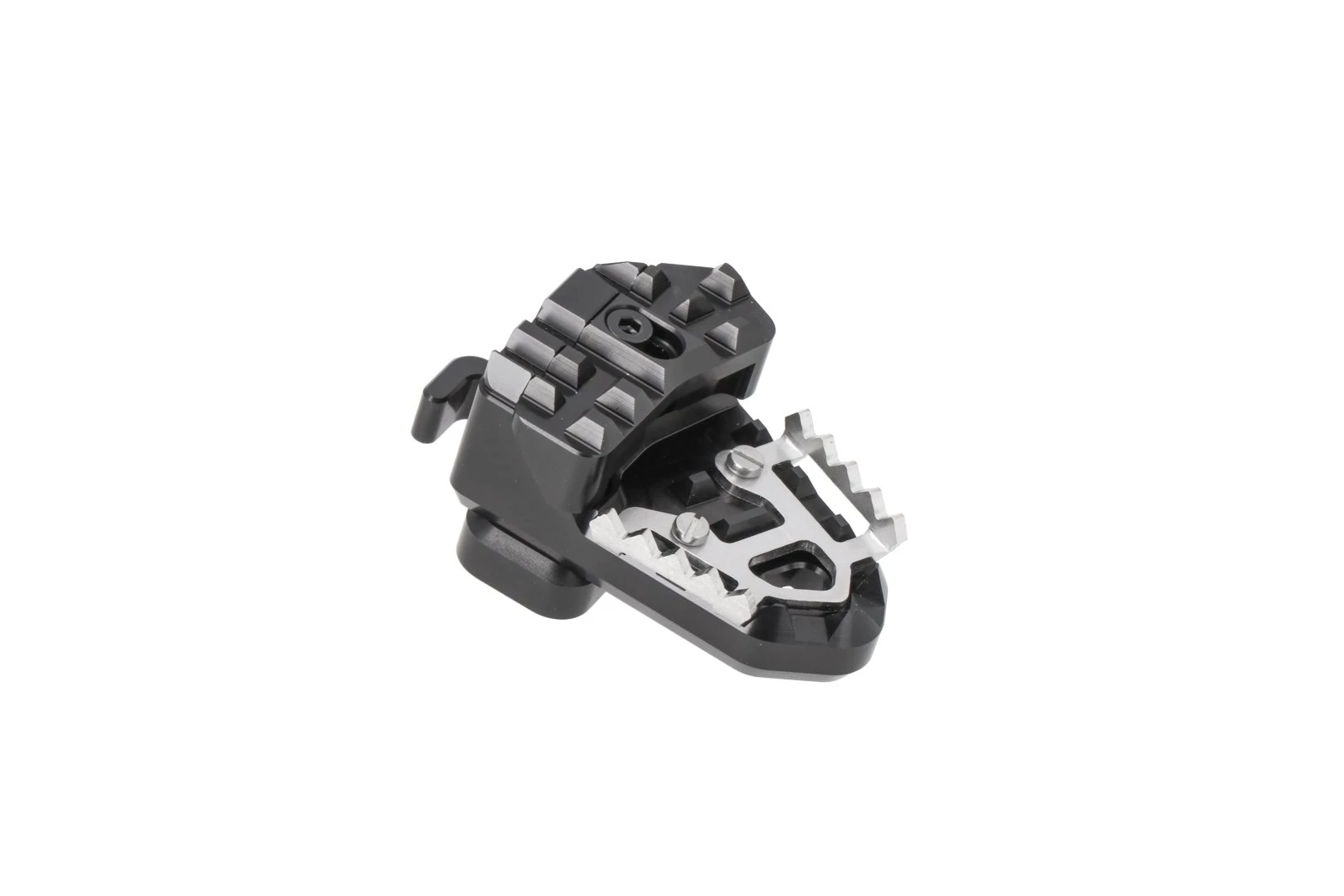 Zusätzlich zur Erhöhung verfügt die Fußbremshebel-Erweiterung über eine verbreiterte Auflagefläche. Diese ist mit einer gezahnten Oberfläche versehen und bietet dadurch besseren Halt bei verschmutzter oder nasser Oberfläche des Hebels.