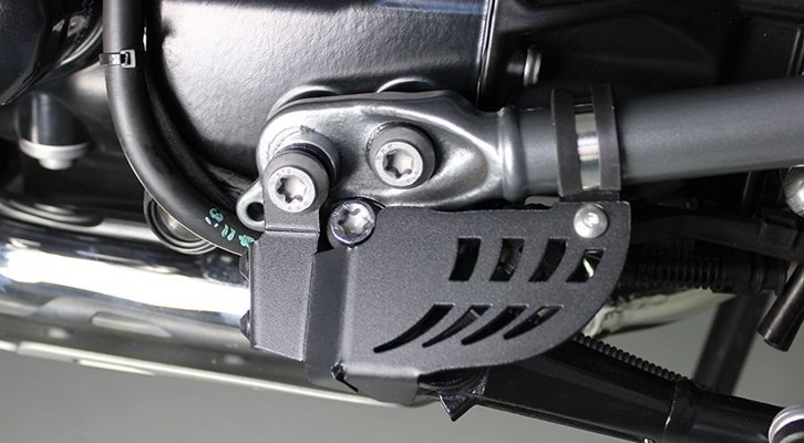 Schutzabdeckung aus Aluminium für den Sicherheitsschalter am Seitenständer. Durch seine Lage außen am Gelenk des Seitenständers kann der Sicherheitsschalter bei Geländefahrten leicht beschädigt werden. Die Abdeckung bietet einen zuverlässigen Schutz gegen Steinschlag und leichten Kollisionen im Gelände. Einfach anzubringen, inklusive Montagematerial. Kann auch mit Sturzbügel verwendet werden (siehe Bild 4).