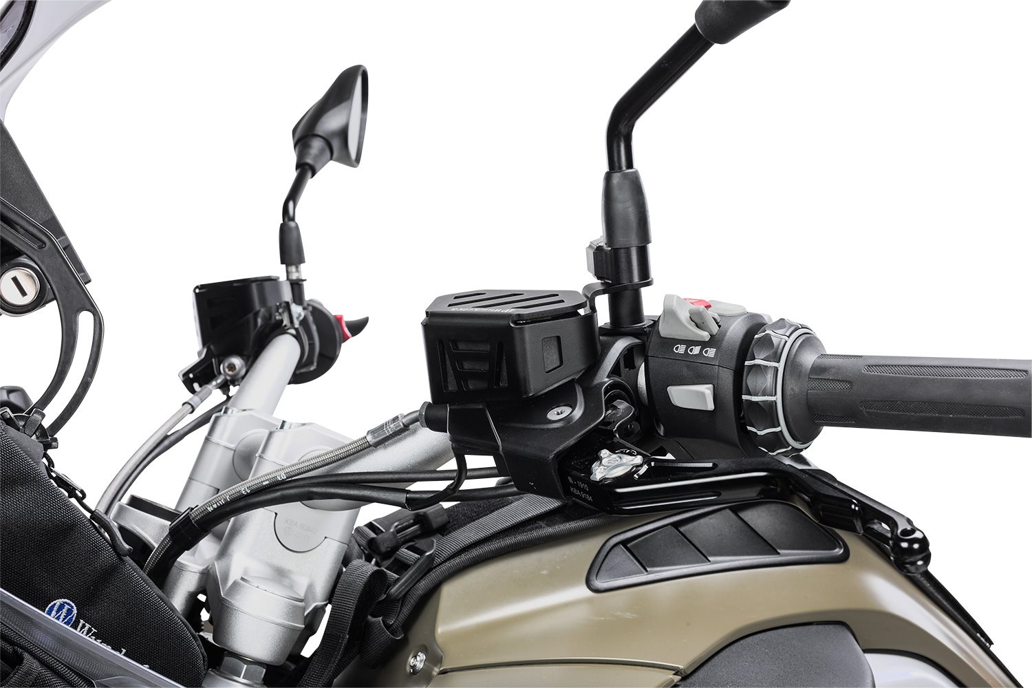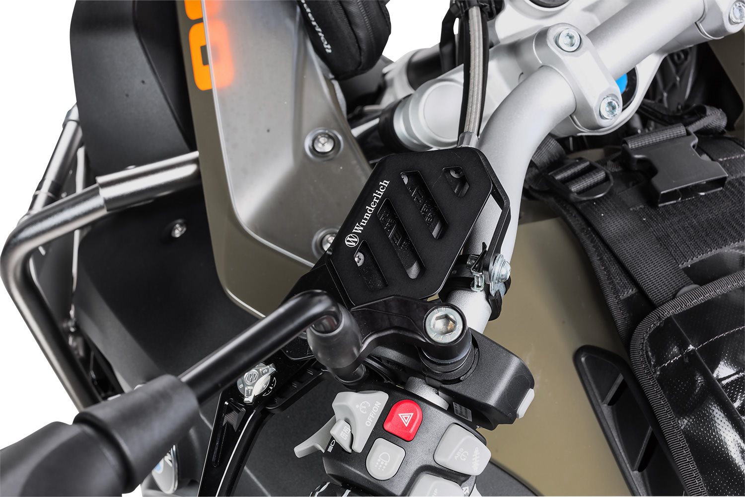 Die Hydraulikbehälter sind dermaßen exponiert und empfindlich, dass schon einfache Umfaller zum Aus führen. Eine teure Reparatur und nicht selten der Urlaubsabbruch sind die Folge. Drei kaputte Behälter später haben wir diesen Schutz entwickelt, der sich direkt an der Lenkerverschraubung abstützt und noch zusätzlich an der Spiegelbefestigung befestigt wird. Deshalb machte es Sinn, dickwandiges Aluminium zu verwenden, das Schläge an die ausgeklügelten Halter weitergeben kann, ohne selbst zerstört zu werden.