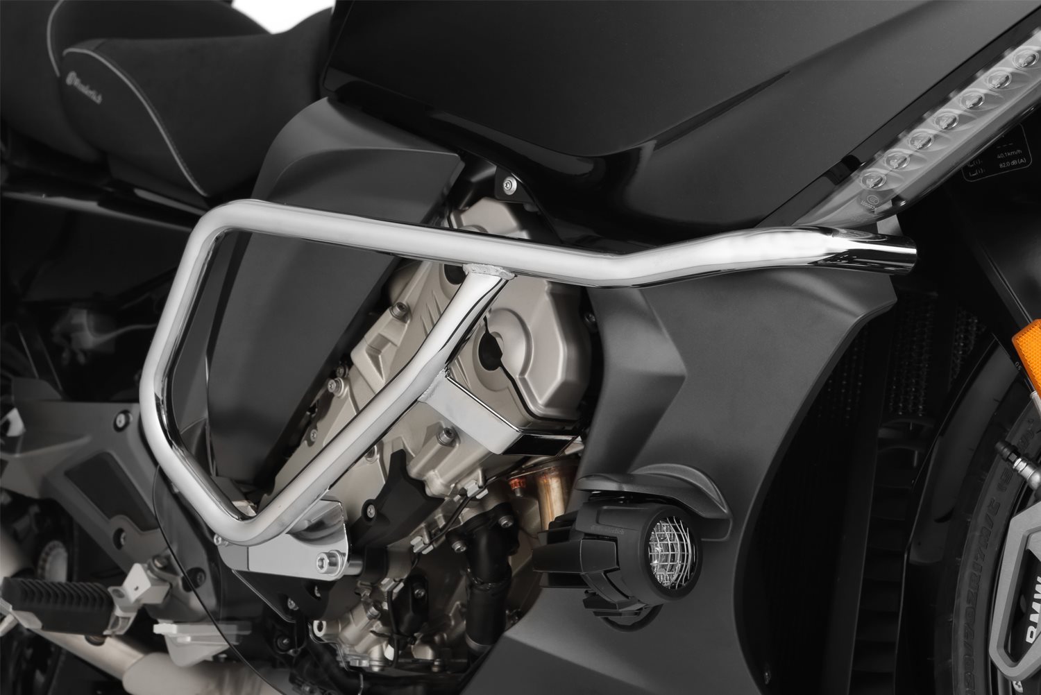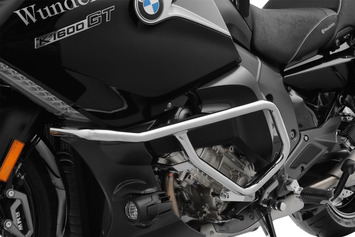 Mit der Entwicklung dieses Sturzbügels ist uns ein perfekter Spagat gelungen. Auf der einen Seite integrieren wir einen formschönen Sturzbügel in die trotz ihrer Größe sehr dynamisch wirkende K 1600, ohne sie noch gewaltiger erscheinen zu lassen. Wir setzen sowohl die optischen Linien der Verkleidung, als auch die des schräg eingebauten Motors fort. Auf der anderen Seite schützen wir mit dem aufwändig gebogenen Rundrohr die empfindliche Verkleidung des Megatourers nicht nur bei Umfallern, sondern auch bei schlimmeren Stürzen.Jeder Sturzbügel ist an drei Aufnahmepunkten befestigt, die sowohl auf Zug-, als auch auf Druckbelastung ausgelegt sind. Im Falle eines Falles werden die Kräfte auf die Haltepunkte verteilt. Bei Wartungsarbeiten entsteht durch die Bügel kein zusätzlicher Arbeitsaufwand. Die Bodenfreiheit wird nicht beeinträchtigt. Der Sturzbügel kann mit den optional erhältlichen Adaptern (35510-210) mit den Original-Fernscheinwerfern kombiniert werden.