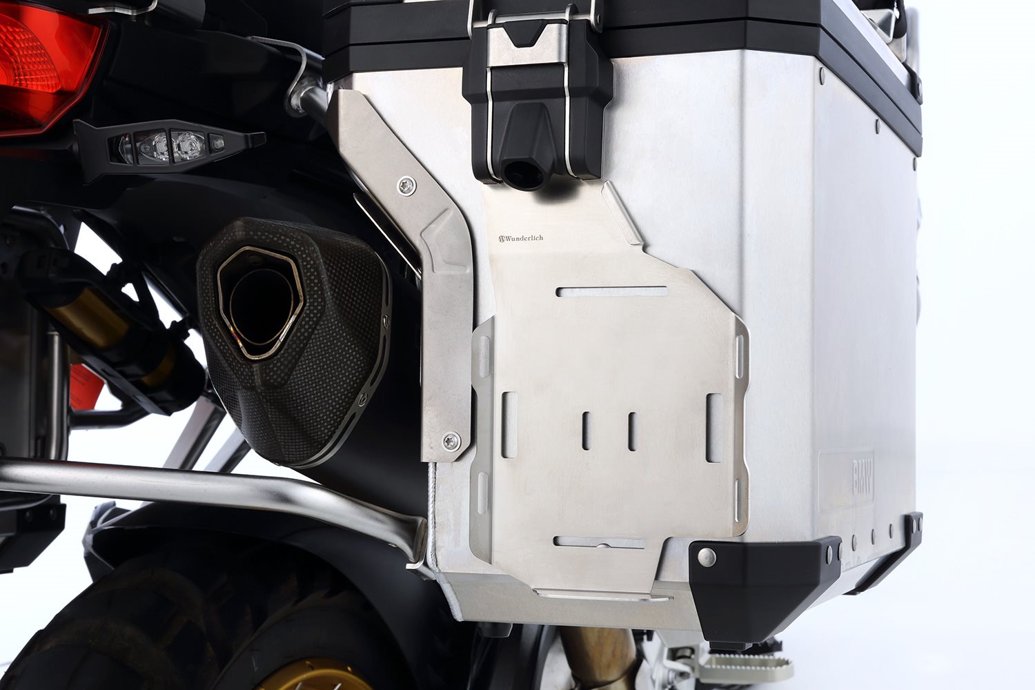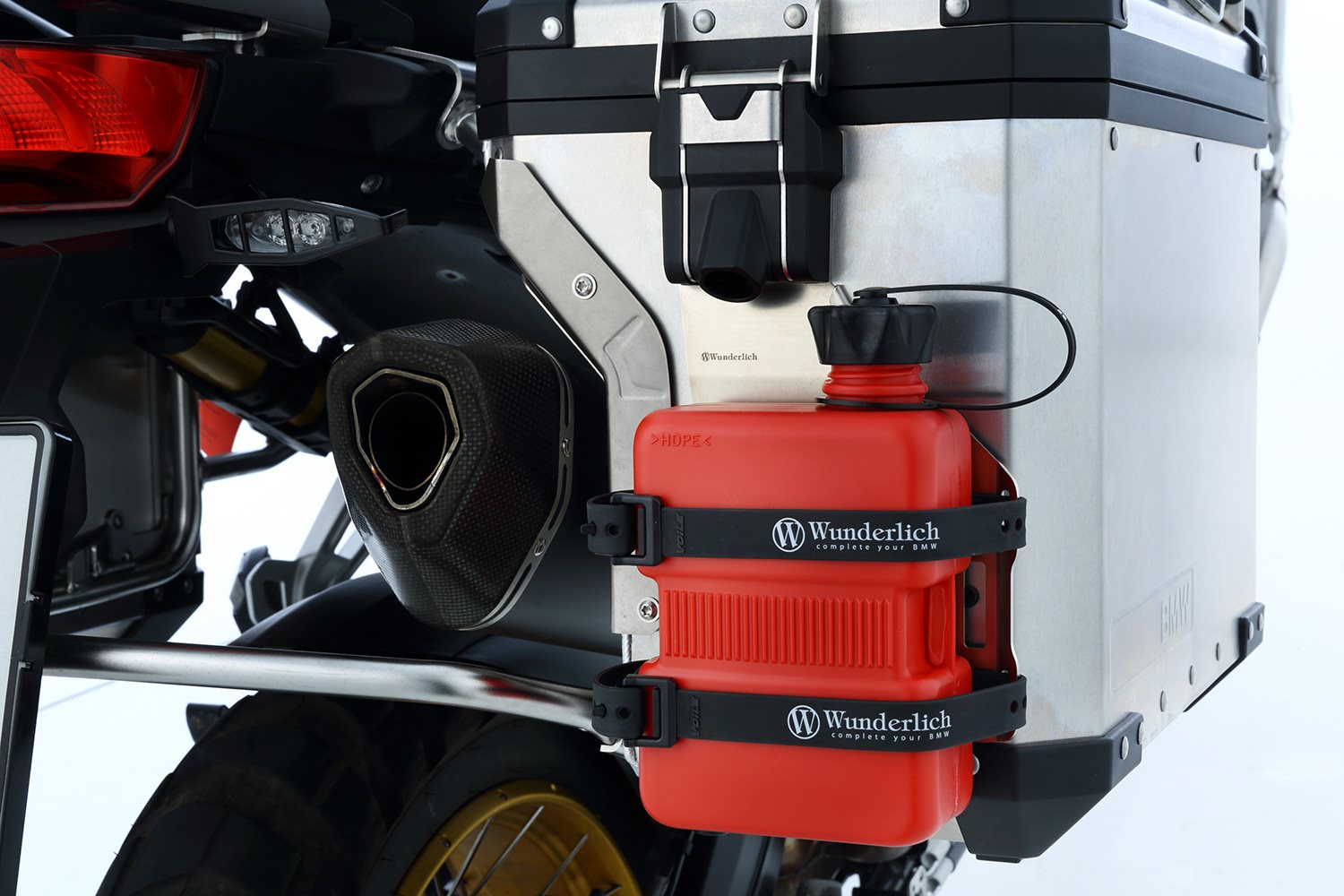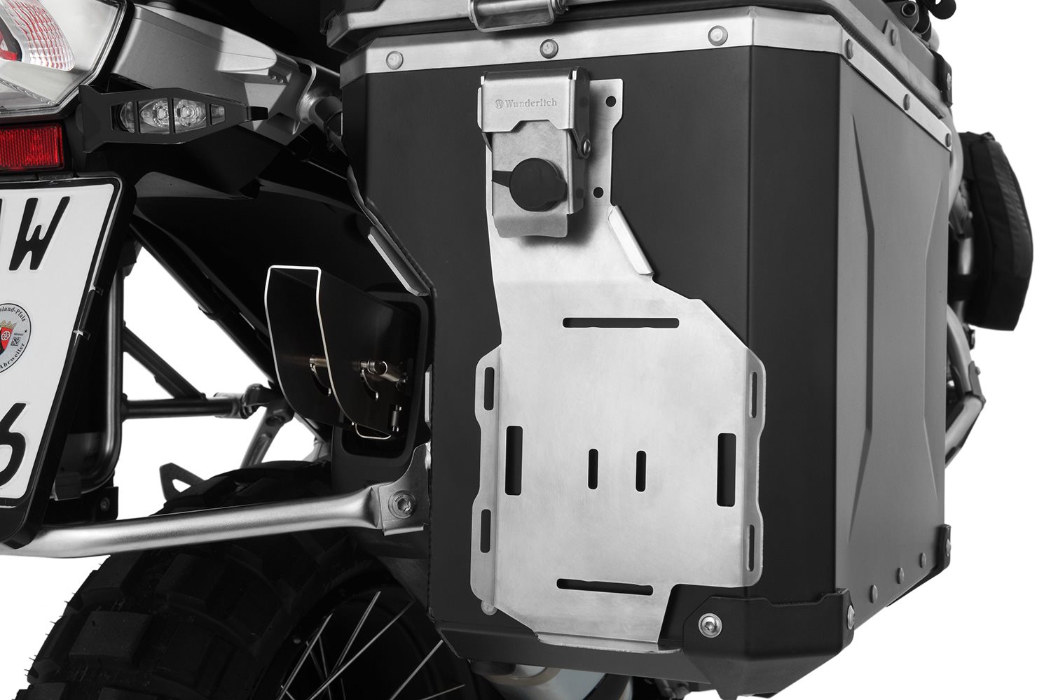 Unser Koffer Rack ist die perfekte Ergänzung für den rechten Koffer und alles, was entweder schnell griffbereit sein soll oder im Koffer nichts zu suchen hat. Es nimmt die gängigen Reisekanister für Benzin, Ölflaschen genauso auf, wie kompakte Vorratskanister für Wasser oder sonstige Reiseutensilien. Wer kennt nicht die ärgerlichen Umstände, wenn Flüssigkeiten auslaufen gerade unterwegs. Und das freiwerdende Koffervolumen kann man sicher für besseres nutzen. Das solide aus Edelstahl gefertigte Rack ist praktischerweise so ausgelegt, dass es zwei unserer Aluminiumflaschen (Art. Nr. 43583-000) nebeneinander aufnimmt. So lassen sich z.B. Öl und Benzin komfortabel getrennt mitführen. Die Sicherung erfolgt mittels Gurtbändern und den im Rack integrierten Zurröffnungen. Unsere praktischen Gurtbänder (Art. Nr. 25120-012 - bitte extra bestellen) eignen sich perfekt zum Befestigen aller möglichen Gegenstände am Rack. Das Rack passt an unsere Koffer EXTREME (nicht die schmale slimline Variante), sowie an die originalen BMW Aluminium Koffer. Die Montage ist jeweils am rechten Koffer möglich. Die sichere Anbringung ist denkbar einfach: Das Rack wird oben am jeweiligen Kofferschloss dauerhaft und diebstahlgeschützt an vorhandenen Punkten befestigt. Am unteren Bereich wird das Rack mittels Klett sicher am Koffer fixiert. Es dient gleichzeitig zur Dämpfung. Es ist also nicht erforderlich am Koffer Löcher zu bohren, die die Gefahr bergen, dass sie zur Undichtigkeit führen. Die Fakten: Funktion Technische Daten BesonderheitenBeschreibung zu Wunderlich Koffer-Rack - silber - rechts anzeigen