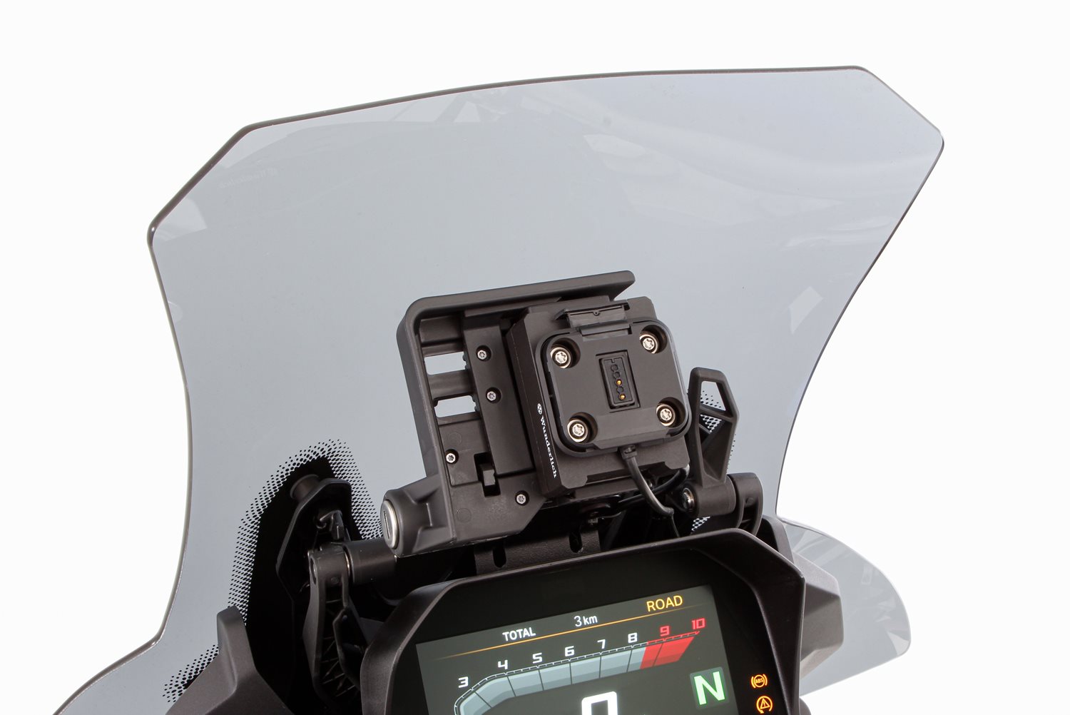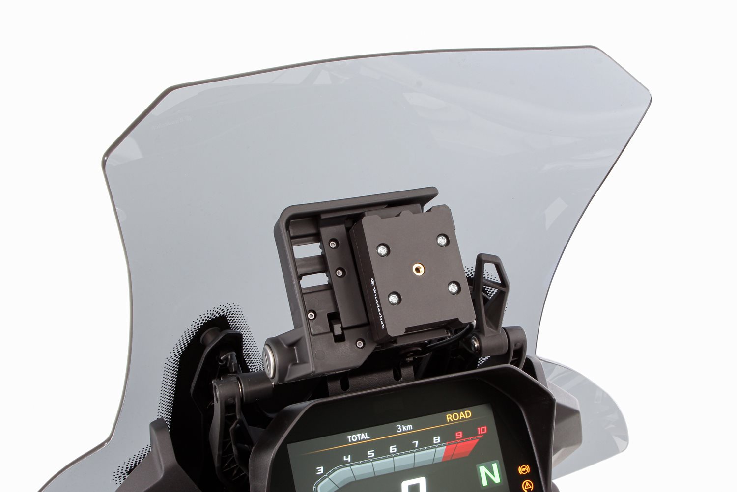 Das zentral angeordnete Schraubgewinde dient als Vorbereitung zur Aufnahme unseres MultiClamp- oder des SP-Connect Adapters. Eingeschraubt können diese zur Aufnahme des MultiClamp Smartphone-Halters (45155-102) oder der modellspezifischen SP-Connect Smartphonehülle (45150-xxx) genutzt werden.