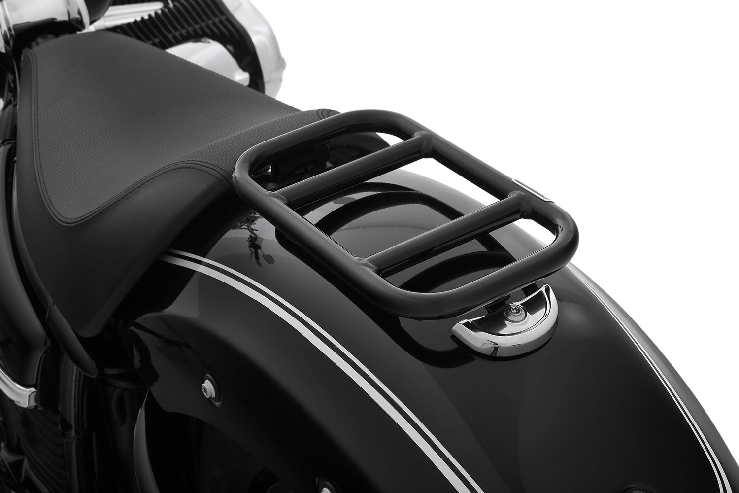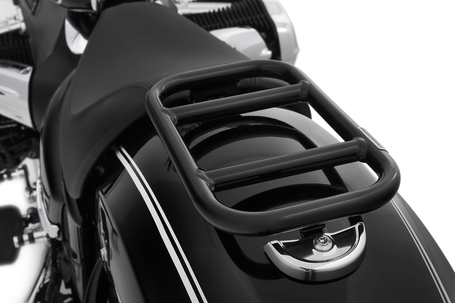 Dieser Gepäckträger ist die leicht zugängliche und flexibel nutzbare Lösung für alle BMW R18 Fahrer, die, allein unterwegs, gerne Taschen oder sonstiges Reisegepäck cruisergerecht und sicher unterbringen möchten. Auf Reisen spielt er sein Potential in Kombination mit unseren Seiten- und Satteltaschen - oder denen von BMW - aus und nimmt zusätzliches Gepäck auf. Das klare Grunddesign des Gepäckträgers setzt dasjenige unserer beliebten Tankreling fort, sodass beide Trägersysteme nicht nur die Kapazität zum Transportieren von Taschen oder Gepäck spürbar vergrößern, sondern sich auch stilistisch hervorragend ergänzen. Zusätzlicher Vorteil: Die schwerpunktgünstige Platzierung unterstützt das wunderbar gutmütige, neutrale Fahrverhalten der BMW R 18. Wir fertigen den Gepäckträger aus 18 mm starkem, schwarz gepulvertem Präzisionsstahlrohr. Als solide Basis zur Befestigung dienen die gleichen Montagepunkte, die den Soziussitz aufnehmen. Dabei bleibt die halbrunde, hintere Chromblende selbstverständlich erhalten. Durch die unkomplizierte, durchdachte Montage lassen sich Gepäckträger und Soziussitz je nach Bedarf mit wenig Aufwand einfach wechseln. Smarte Ergänzung zum Gepäckträger: Die Fahrer Rückenstütze, die sich zum Soziussitz verwandelt Zusätzlich bieten wir eine klappbare Fahrerrückenstütze an, die sich, nach hinten geklappt, im Handumdrehen zum Soziussitz wandelt und sich dabei formschlüssig auf dem Gepäckträger abstützt. In beiden Positionen wird sie mit einem Bolzen zuverlässig arretiert. Voraussetzung für die Montage der Fahrerrückenlehne ist der Gepäckträger. Die Verschraubung erfolgt mit diesem zusammen am vorderen Montagepunkt des serienmäßigen Soziussitzes. Diese Rückenlehne finden Sie unter der Artikelnummer 18110-106. Die Fakten Funktion Technische Daten Ihre Wunderlich VorteileBeschreibung zu Wunderlich Soziusgepäckträger- schwarz-glänzend anzeigen