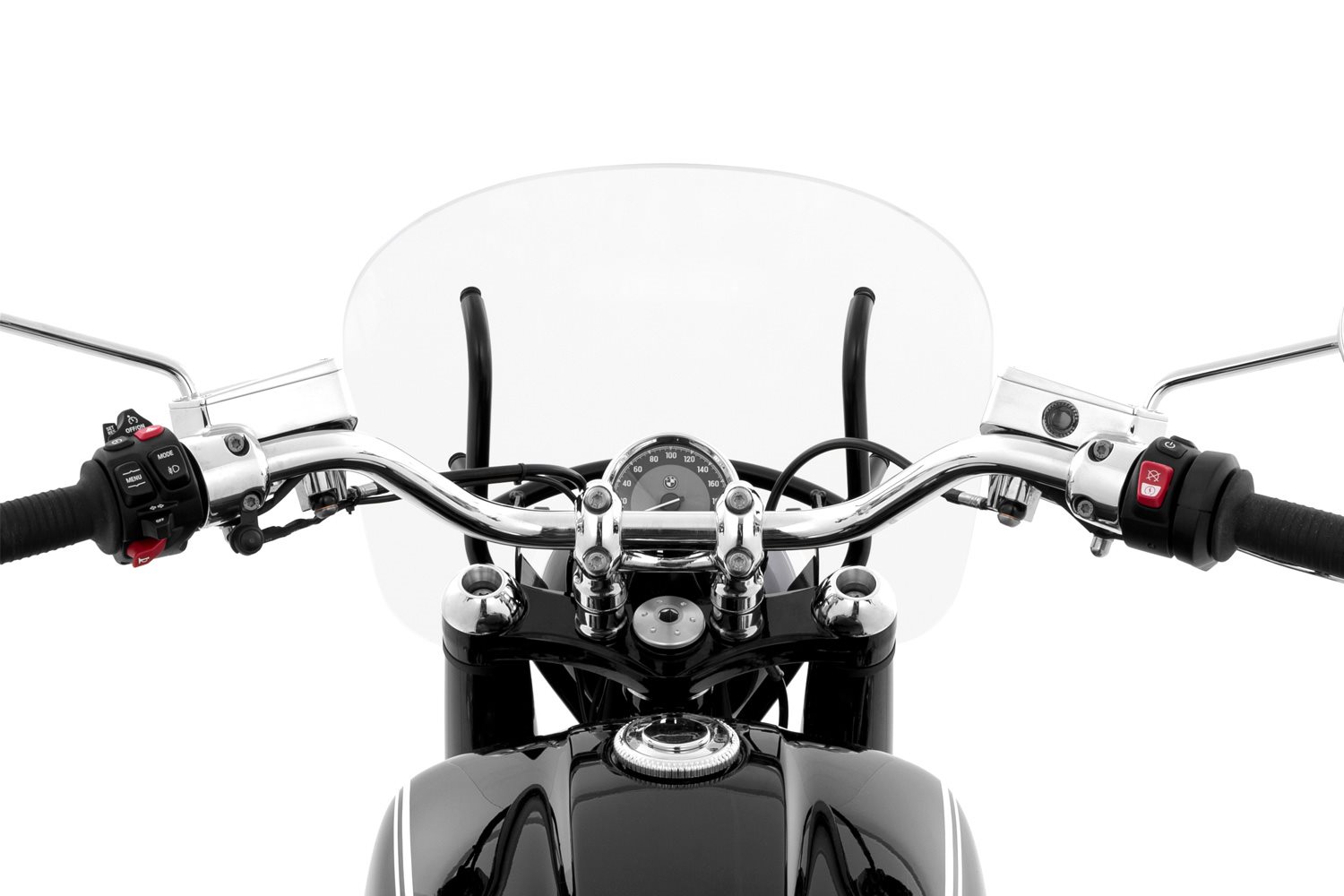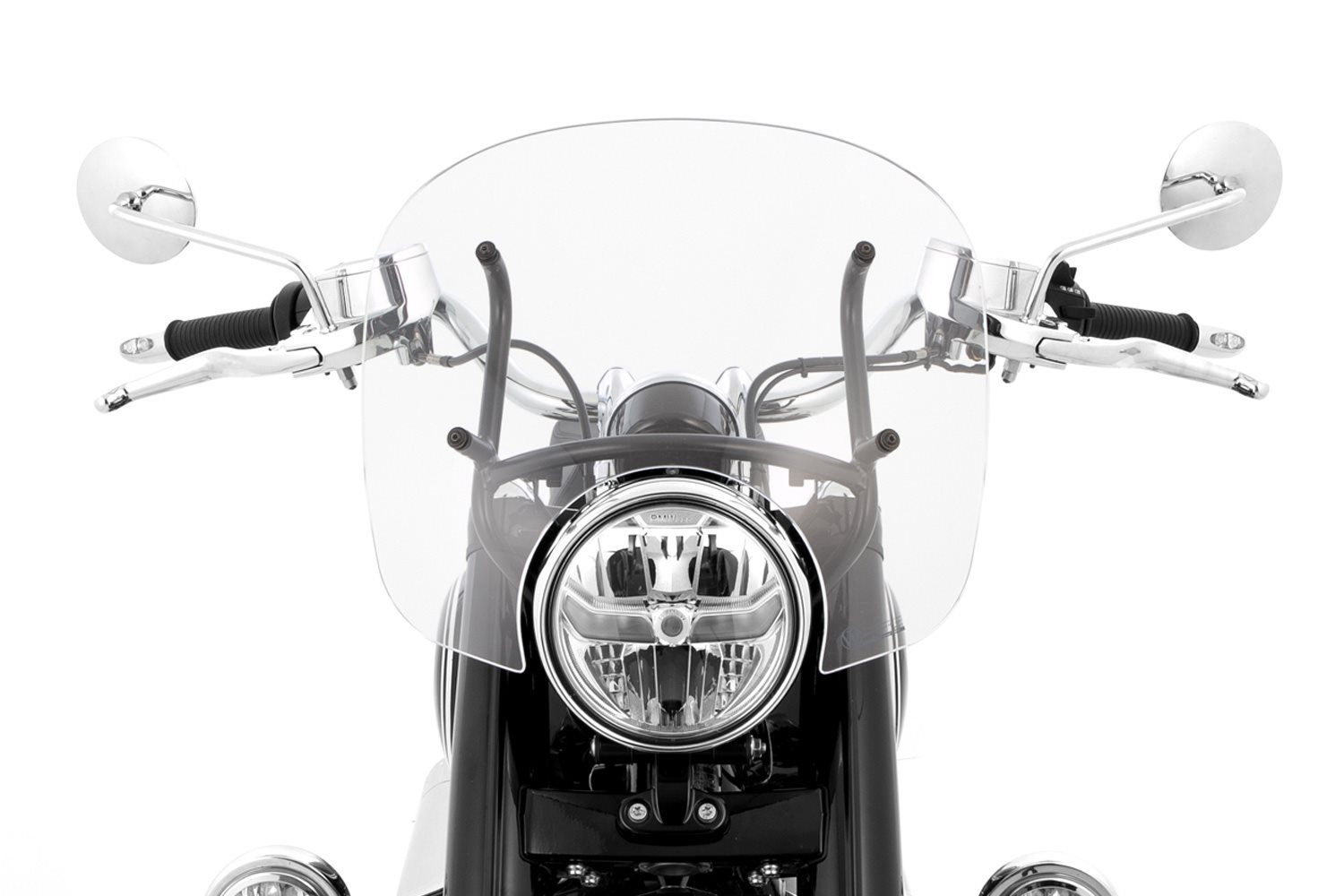 Die Scheibe ist so dimensioniert, dass der Oberkörper von der Windlast befreit ist. Die Aerodynamik sorgt für eine angenehm laminare Strömung des Fahrtwinds. Die hochwertige Verarbeitung erkennt man schon beim ersten Blick durch die kratzfeste, benzin- und UV- beständige, 5 mm dicke Scheibe: Klare Durchsicht, ohne verzerrende optische Fehler, die irritieren. Weiteres Markenzeichen: Die handpolierte, umlaufende Kante der Scheibe, die einen separaten Kantenschutz überflüssig macht. Nur so bietet die Scheibe neben aerodynamischen Vorteilen und der Verminderung der Windgeräusche einen ungestörten Blick nach vorne. All das erlaubt ein lässiges, ausgesprochen entspanntes und aufrechtes Sitzen bei freiem Blick über den oberen Rand der einstellbaren Scheibe.