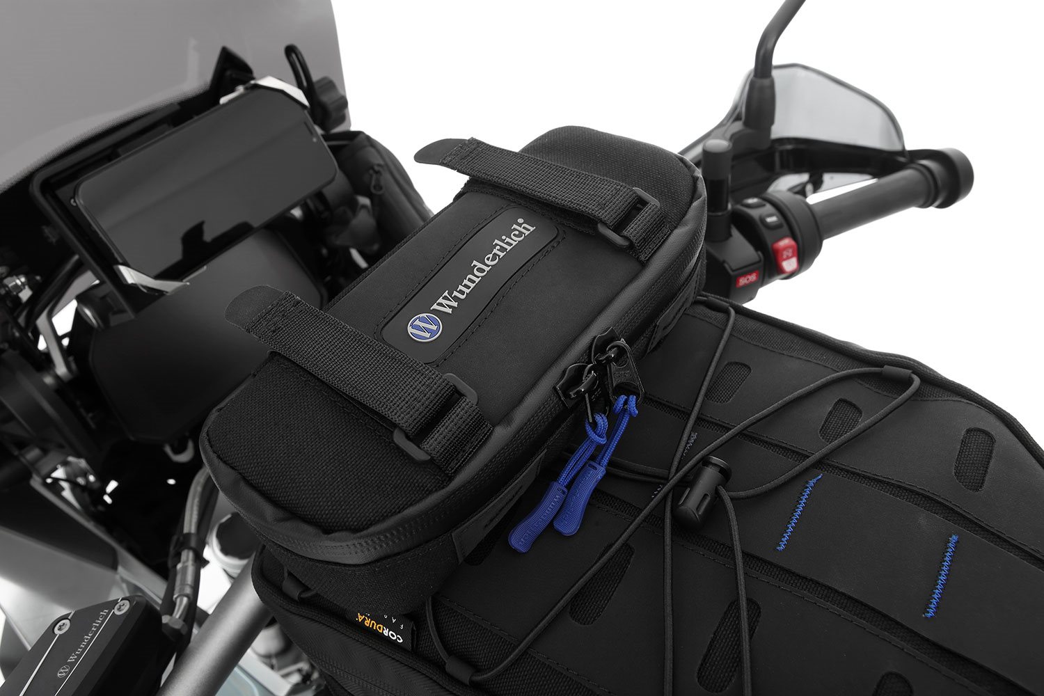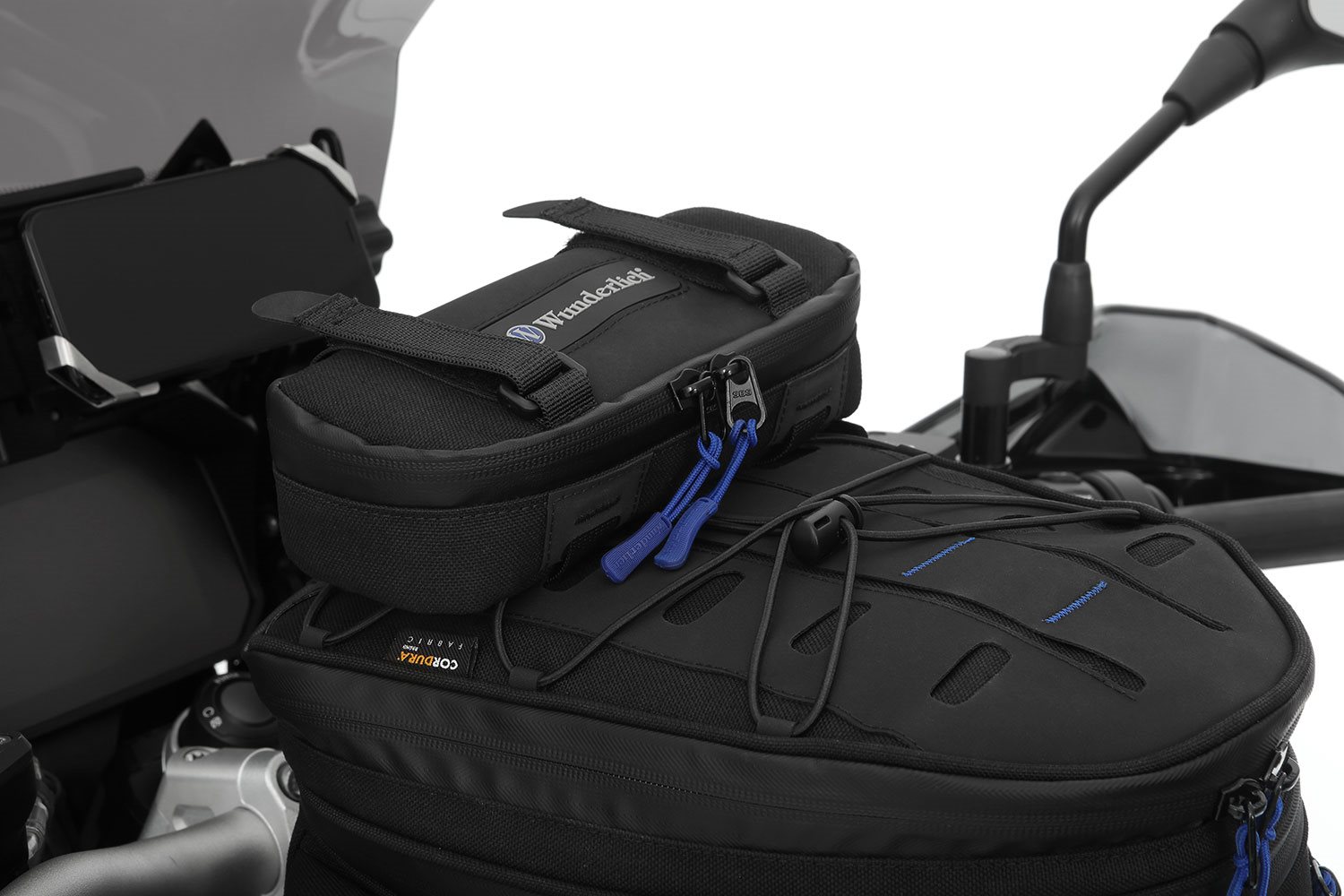 Wir fertigen sie aus robustem, langlebigen Cordura, das wir an neuralgischen Stellen mit einer hochwertigen Gummierung zum Schutz versehen. Die formstabilisierende Polsterung der Aufsatztasche schützt den Inhalt zuverlässig und vermeidet jegliches Ausbeulen oder Flattern bei hohen Geschwindigkeiten. Unser hauseigenes, blaues Futter sorgt für Kontrast und Übersichtlichkeit im Inneren. Die Reißverschlüsse sind ELEPHANT typisch spritzwassergeschützt und mit ergonomisch griffigen, blauen Zippern ausgestattet.