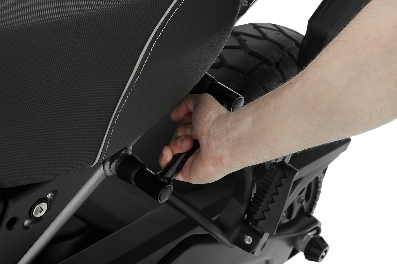 Bei diesem Griff handelt es sich um ein sehr, sehr hilfreiches und ergonomisches Bauteil, denn leider bietet die Pan America keine geeignete Möglichkeit, um sie kräftesparend und sicher auf den Hauptständer aufzubocken. Unser Aufbockgriff wird gut zugänglich auf der linken Seite, an zwei Anschraubpunkten an der Soziusrastenaufnahme, montiert. So lässt sich die Maschine spürbar leichter und vor allem sicherer auf den Hauptständer aufstellen. Dies liegt daran, dass der Griff gut in der Hand liegt und man damit deutlich mehr Kraft übertragen kann, als an den Rahmenrohren, die schlecht zu greifen oder durchs Gepäck gar nicht zugänglich sind. Wir fertigen unseren Aufbockgriff sehr hochwertig aus Stahl, das Design ist dezent und funktional. Fakten Funktion Technische Daten Ihre Wunderlich VorteileBeschreibung zu Wunderlich Aufbockgriff- schwarz anzeigen