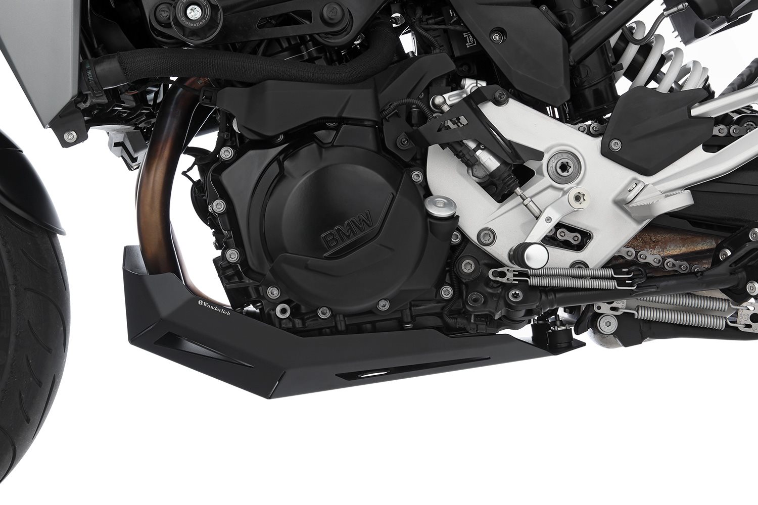 Der Motorschutz aus Aluminium ist korrosionsbeständig und schwarz beschichtet. Konstruktiv konnten wir das Bauteilgewicht optimieren und gleichzeitig hohe Bauteilsteifigkeiten sowie mechanische Formstabilität realisieren. Das Ergebnis ist ein widerstandsfähiger, gewichts- und formoptimierter Motorschutz nach dem Gestaltungsprinzip des Form follows function“, der wunderbar eng anliegt und damit die Flyline des Motorrads perfekt flankiert. Und der nicht nach Enduro aussieht.