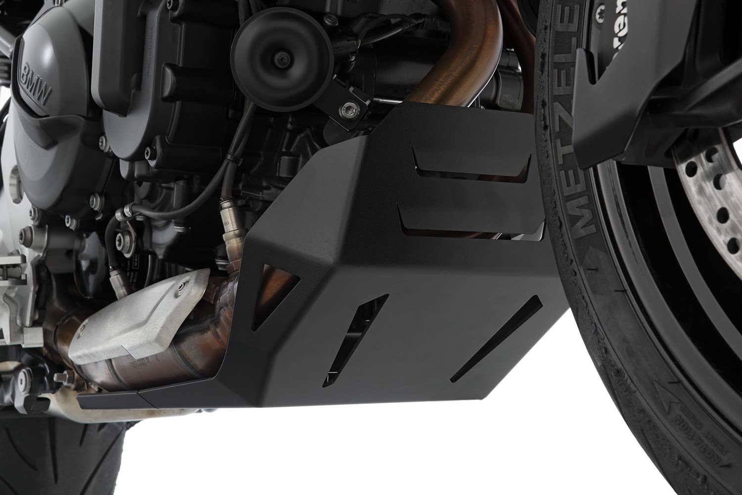 Das funktionale Edge-Design und die konstruktive Integration unseres aus Aluminium gefertigten, einteiligen Motorschutzes STREET bietet den umfassenden Schutz für das Motorgehäuse, die Ölwanne, die Krümmer und den Katalysator. Die frontalen und die seitlich rechts und links eingegliederten Ventilationsöffnungen unterstützen die Kühlung des Motors und der Aggregate, besonders wenn es lange Distanzen auf der Autobahn zu überwinden gilt. Angewinkelte Prallbleche lenken Steinschlag oder Fremdkörper, die vom Vorderrad aufgewirbelt werden jedoch so ab, dass die Gefahr für Beschädigungen an den Krümmern und dem Motor erheblich reduziert wird. Ein weiterer Vorteil dieses Motorschutzes ist: Er lenkt schwallartig aufgewirbeltes Spritzwasser zum Beispiel beim Queren von Spurrinnen nach unten ab und sorgt besonders bei heißem Motor dafür, den thermischen Stress am Motorgehäuse, Krümmern und Dichtungen erheblich zu mildern.