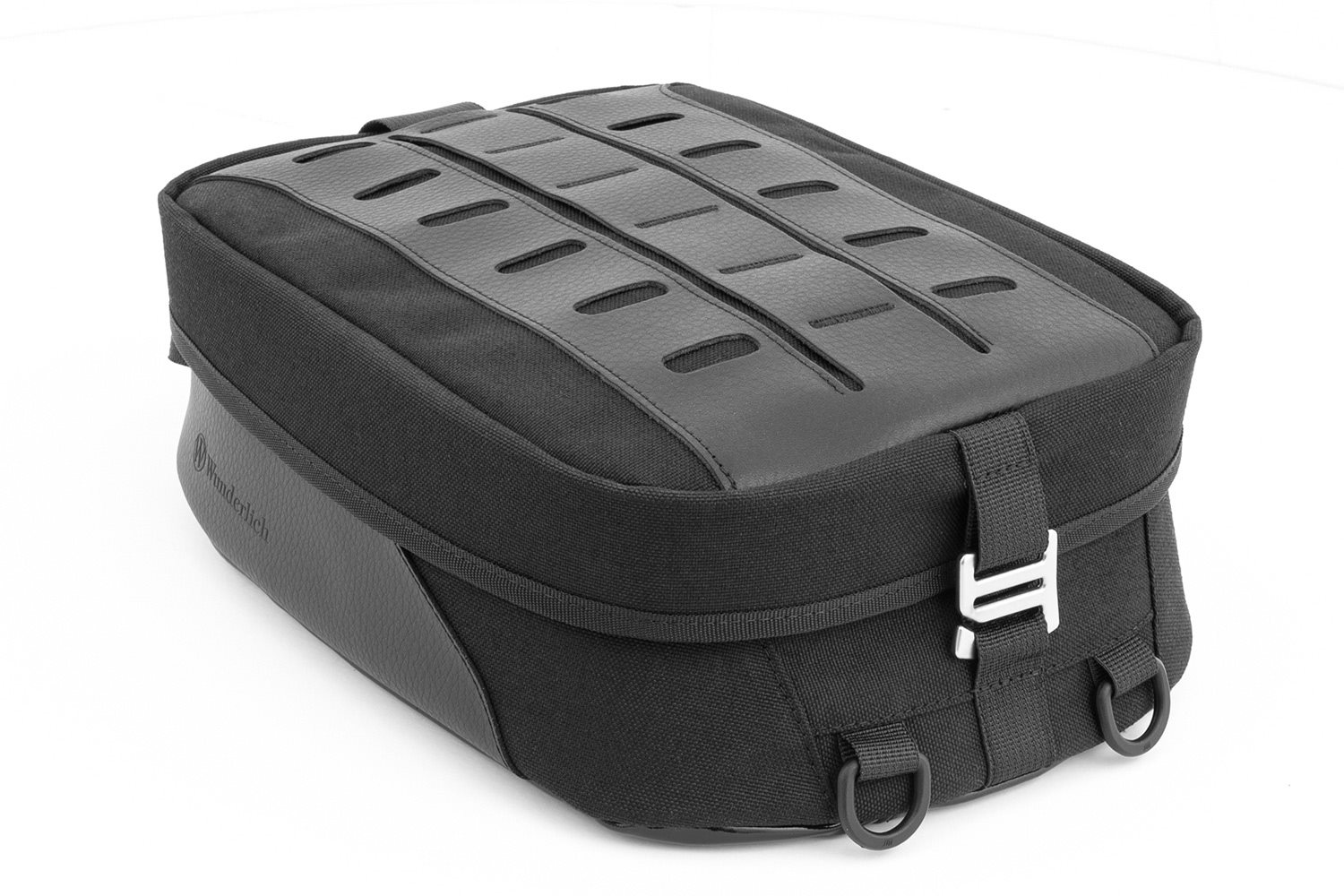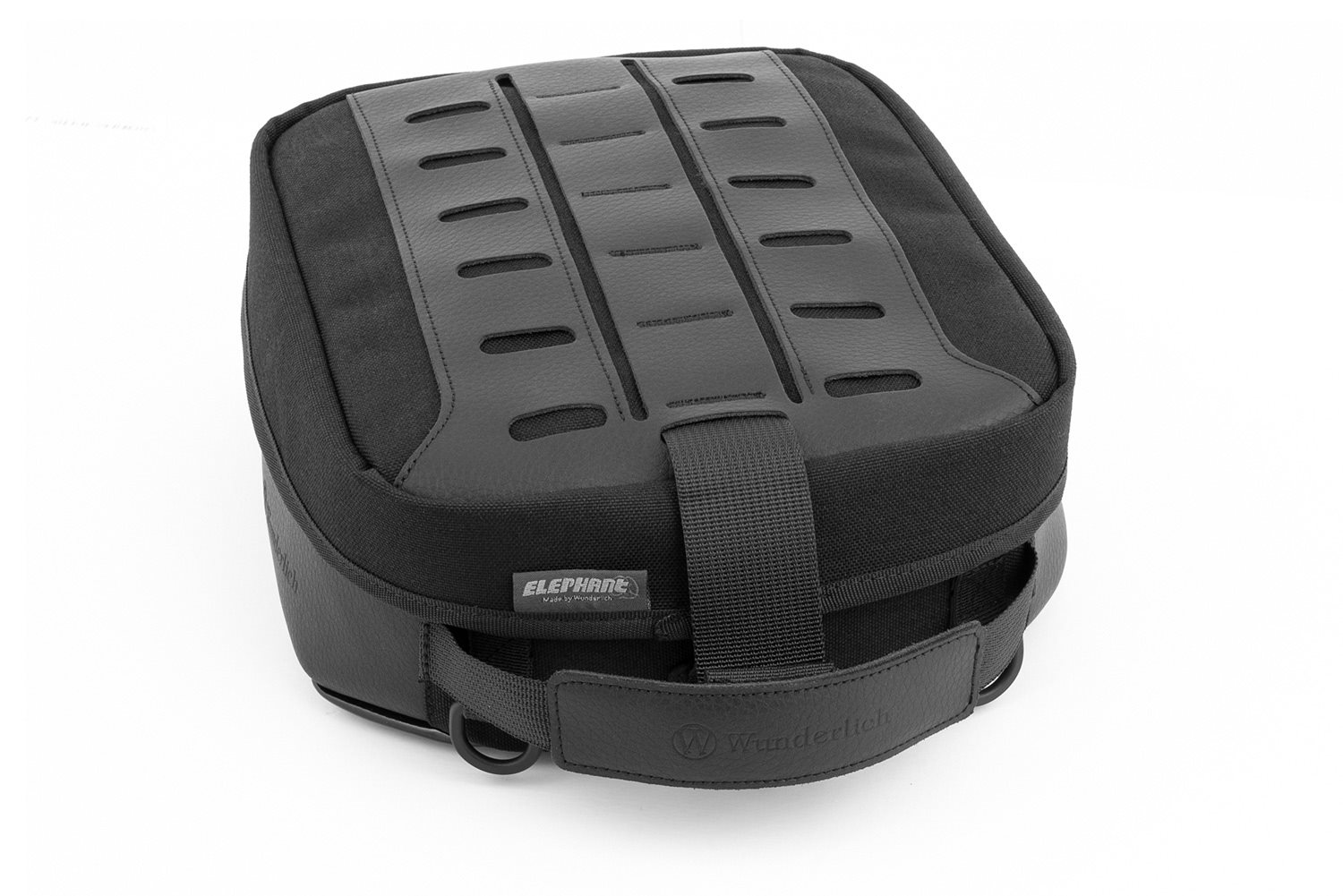 Der Deckel des ELEPHANT CLASSIC bietet innen ein weiteres Einschubfach sowie außen ein dem militärischen Molle-System vergleichbares Haltesystem für zusätzliche Taschen (Aufsatztaschen). Der Deckel, der den Reißverschluss des Hauptfachs abdeckt, ist mit einem handlichen Hakenverschluss ausgestattet. Die Unterseite des ELEPHANT CLASSIC besteht aus einem besonders haftstarken und bewährten Material, das sich an den Tank anschmiegt und den Tankrucksack gegen Verrutschen sichert.