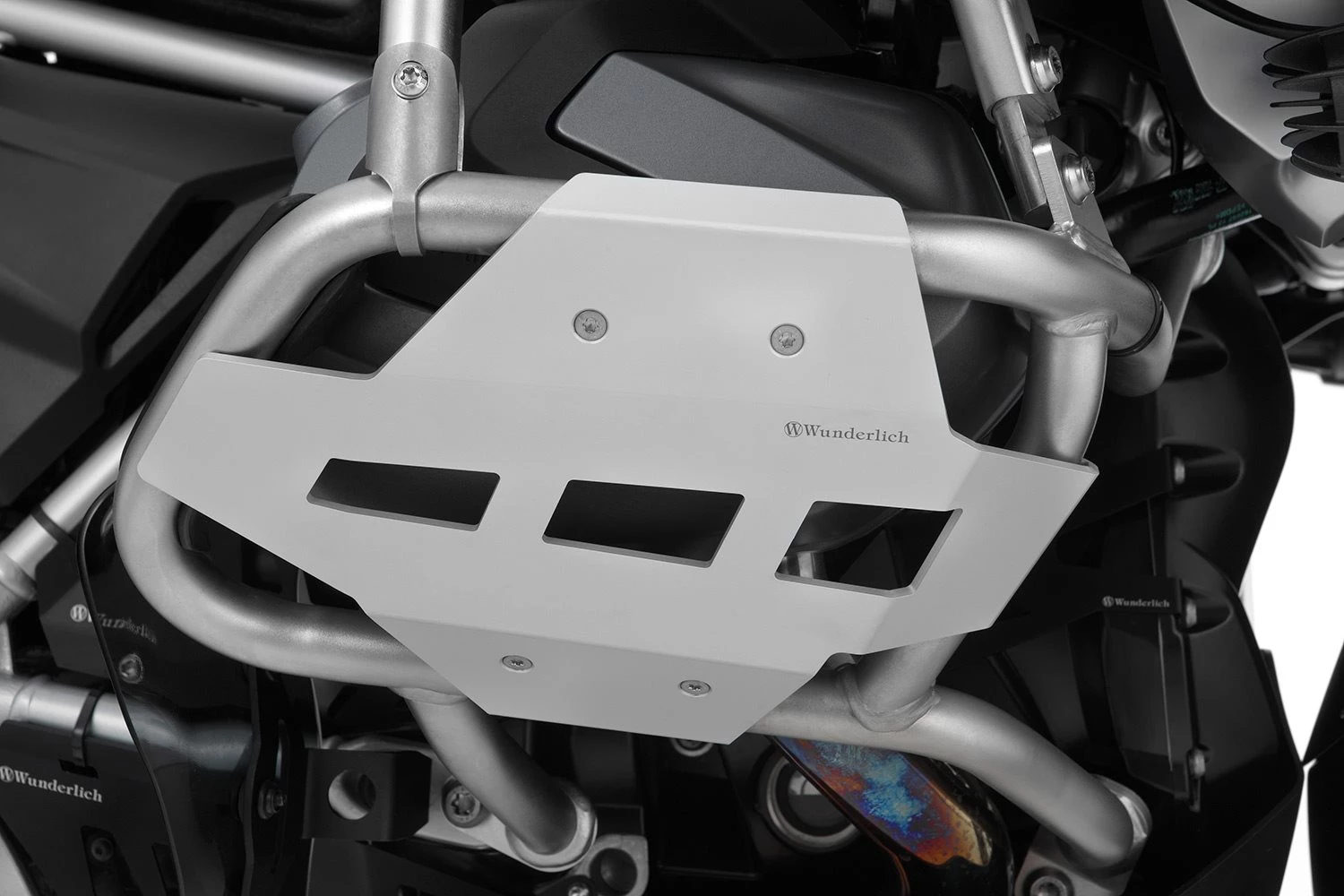 Steinschlag, Äste, Felskanten, ein Umfaller im Gelände oder -schlimmer- ein Sturz, ganz schnell sind die Ventildeckel des ShiftCam-Boxers in Mitleidenschaft gezogen, selbst wenn der Original Motorschutzbügel montiert ist. Kratzer sind dabei noch das Geringste. Bei den 1250er ShiftCam-Motoren gilt es zu berücksichtigen, dass die Konstruktion des ShiftCam-Ventiltriebs ausgesprochen aufwendig ist, und es deshalb Sinn ergibt, den Zylinderkopf vorsorglich zu schützen. Da die exponierten Ventildeckel ausschließlich kraftschlüssig montiert sind, besteht die Gefahr, dass sie sich bei jeglicher Gewalteinwirkung relativ zum Zylinderkopf verschieben und den aufwendigen Ventiltrieb unter Umständen in Mitleidenschaft ziehen. Deshalb kommt dem zusätzlichen Schutz des Zylinderkopfs eine besondere Bedeutung zu. Besonders im harten Einsatz. Deshalb stand im Pflichtenheft unserer Konstrukteure, dass der Zylinderkopfschutz nicht nur Zylinderkopf und Ventildeckel, sondern auch den originalen Motorschutzbügel schützen und ihm zusätzliche strukturelle Stabilität verleihen soll. Die unkomplizierte Montage des aus hochwertigem Aluminium gefertigten Schutzsystems erfolgt deshalb unmittelbar und leicht zugänglich am Motorschutzbügel. Vier Millimeter Bauteilstärke, die formschlüssige, unverrückbare Befestigung mit zwei Klemmungen, die jeweils zweifach verschraubt sind, das sind überzeugende Merkmale für eine robuste und widerstandsfähige Konstruktion, einem Schutzschild gleich. Die drei markanten Aussparungen dienen der Belüftung, ihre charakteristische, nach hinten flacher auslaufende dynamische Form, gliedert sich schlüssig ins Konzept ein. All dies zusammengefasst bildet ein durchdachtes und im wahrsten Sinne des Wortes umfassendes Schutzkonzept für die empfindlichen Zylinderköpfe. Wir fertigen den Zylinderkopfschutz wahlweise silberfarben oder schwarz eloxiert. Der Zylinderkopfschutz kombiniert damit in gewohnter Weise kompromisslose Funktionalität mit integriertem Design. Fakten Funktion Technische Daten Ihre Wunderlich VorteileBeschreibung zu Wunderlich Zylinderkopfschutz für Original Motorschutzbügel R 1250 GS - silber anzeigen