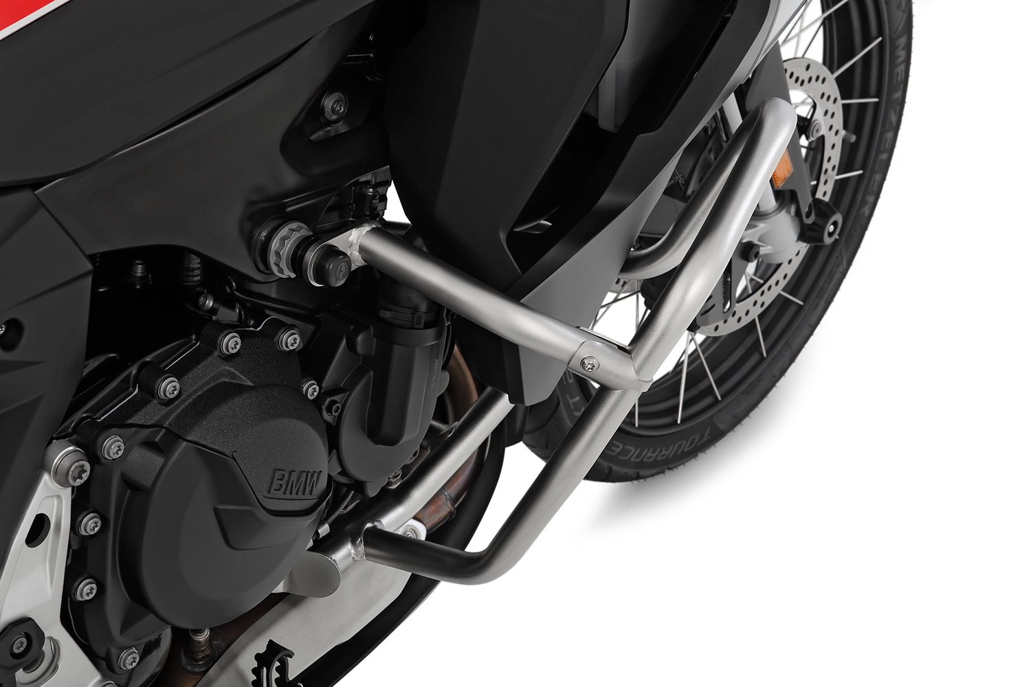 Präzise auf CNC-Rohrbiegemaschinen geformt und sauber verschweißt, fertigen wir die Verstärkung aus Präzisionsedelstahlrohr mit einem Rohrdurchmesser von 25 mm. Die Oberflächen sind glasperlengestrahlt und elektropoliert. So integriert sich die Verstärkung auf dezente Art perfekt ins Design des originalen Motorschutzbügels.