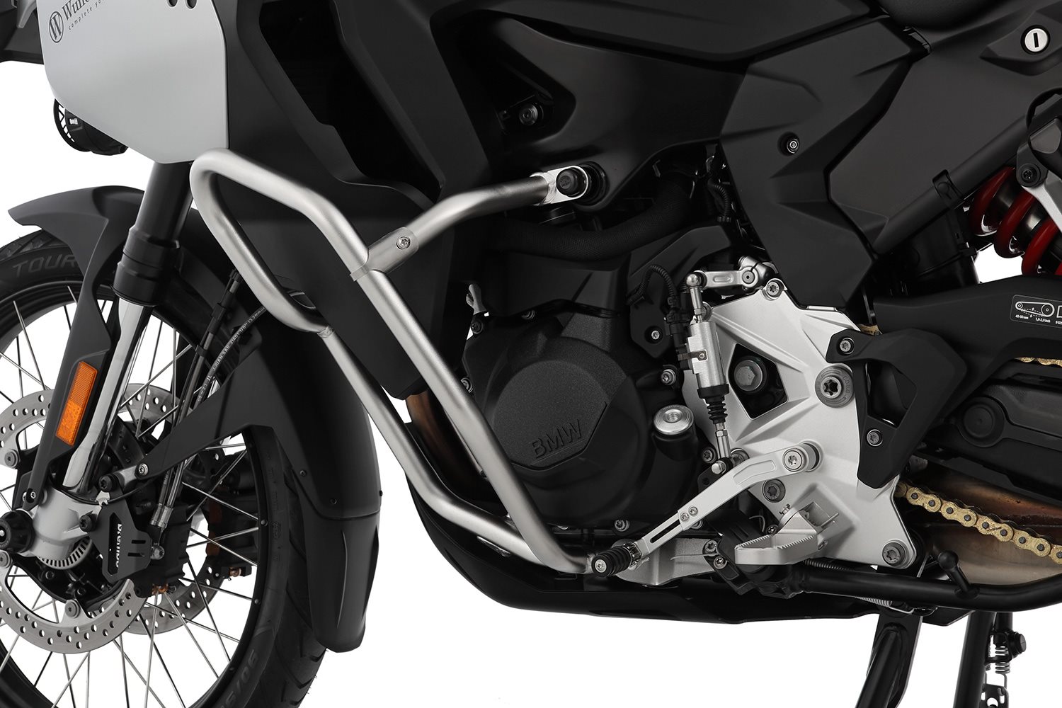 Mit dem Verstärkungsbügel aus hochwertigem Edelstahl beseitigen wir dieses Manko zuverlässig. Er verbindet das hintere, freie Ende des Motorschutzbügels mit dem Rahmen. Damit werden einwirkende Kräfte zusätzlich über den Bügel an der geeigneten Stelle in die Rahmenstruktur eingeleitet. Diese Maßnahme verhindert somit das Nachgeben des Motorschutzbügels und verringert das Risiko von Beschädigungen an den Kupplungs- oder Lichtmaschinenabdeckungen. Dabei sorgt er für zusätzliche Steifigkeit im gesamten Rohrverbund, wobei er konstruktiv so ausgelegt ist, dass seine geschwungene Form zusätzlich für den elastischen Abbau auftretender Belastungsspitzen sorgt.